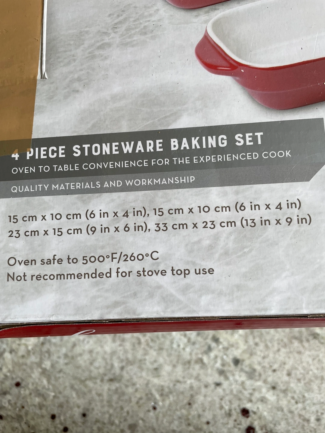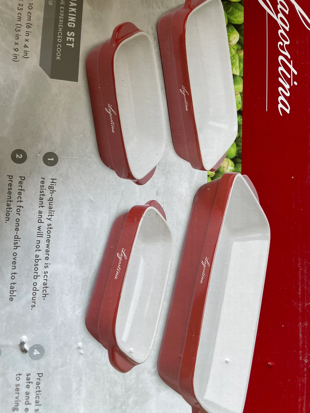 Brand new. Set of four red Lagostina stoneware baking dishes. Suitable for oven, microwave, freezer, and dishwasher. Not recommended for stove top use. Please check all pic. Sizes are in the second pic.