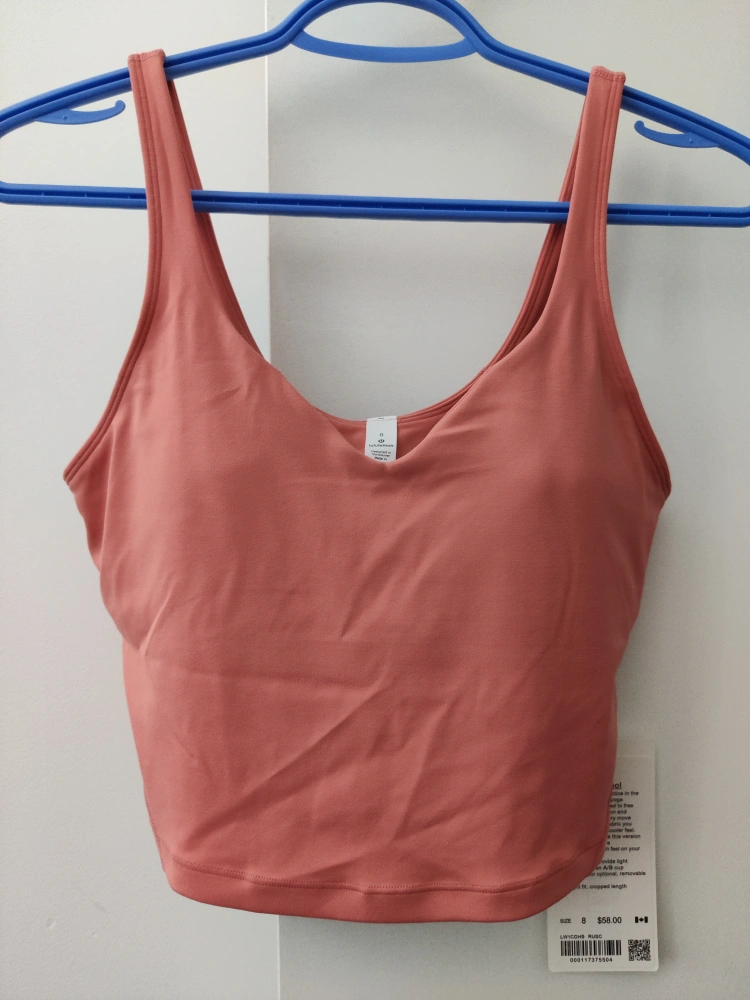 Size 8 in a beautiful flamingo pink colour. It has a tight fit and cropped length. With removable padding.