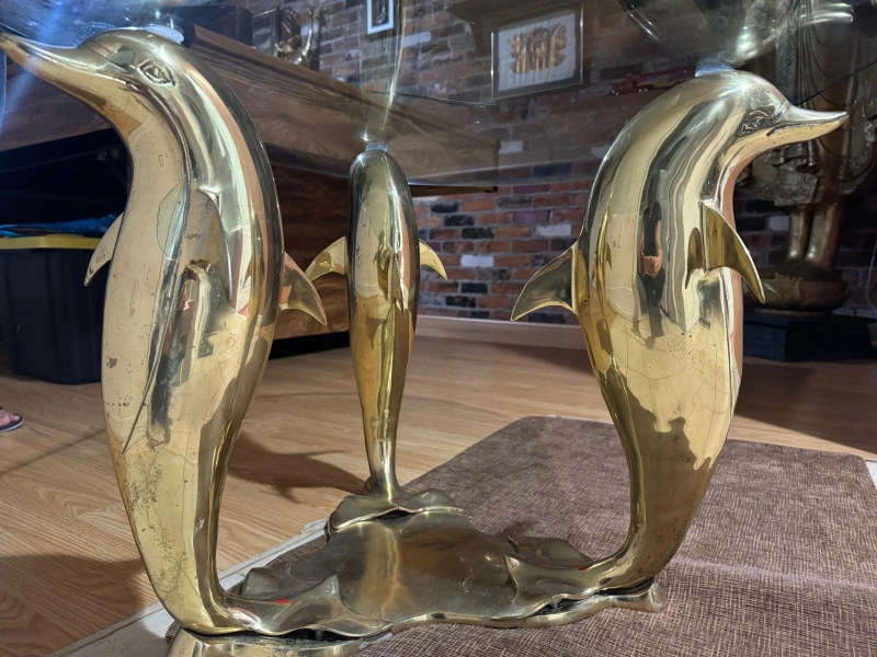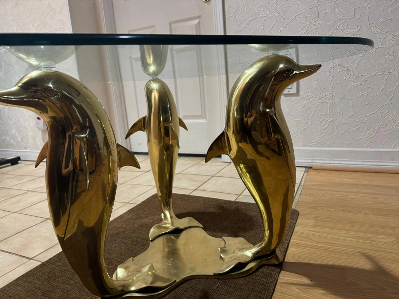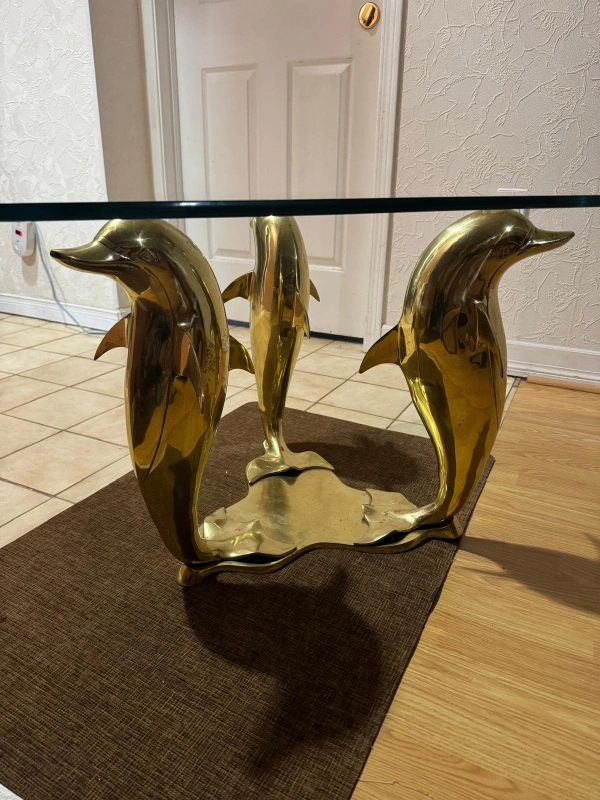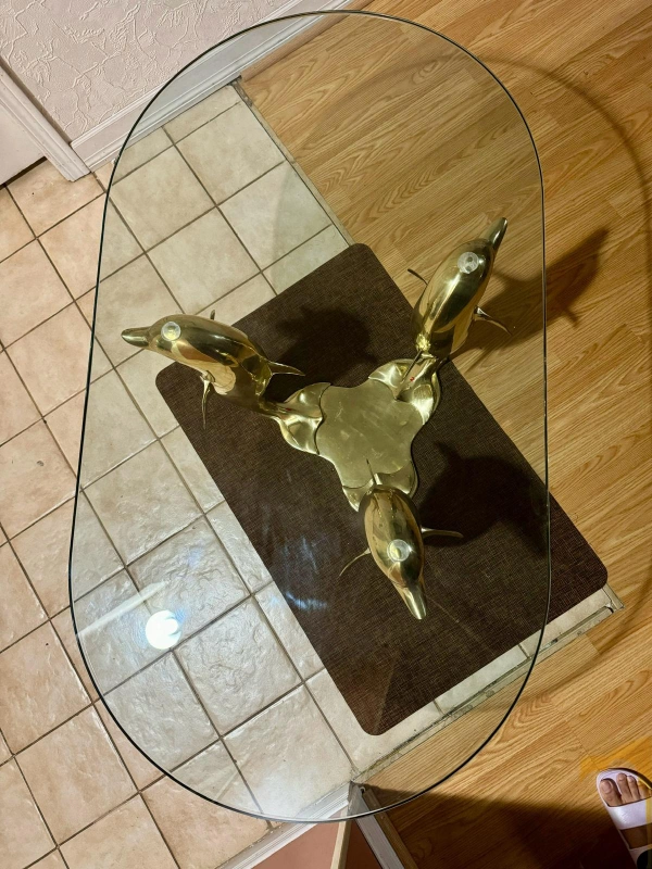 This is a unique glass coffee table with a dolphin design. It is made with solid brass and glass and has a beautiful gold finish. It would be a great addition to any home.It measures 46 by 26.