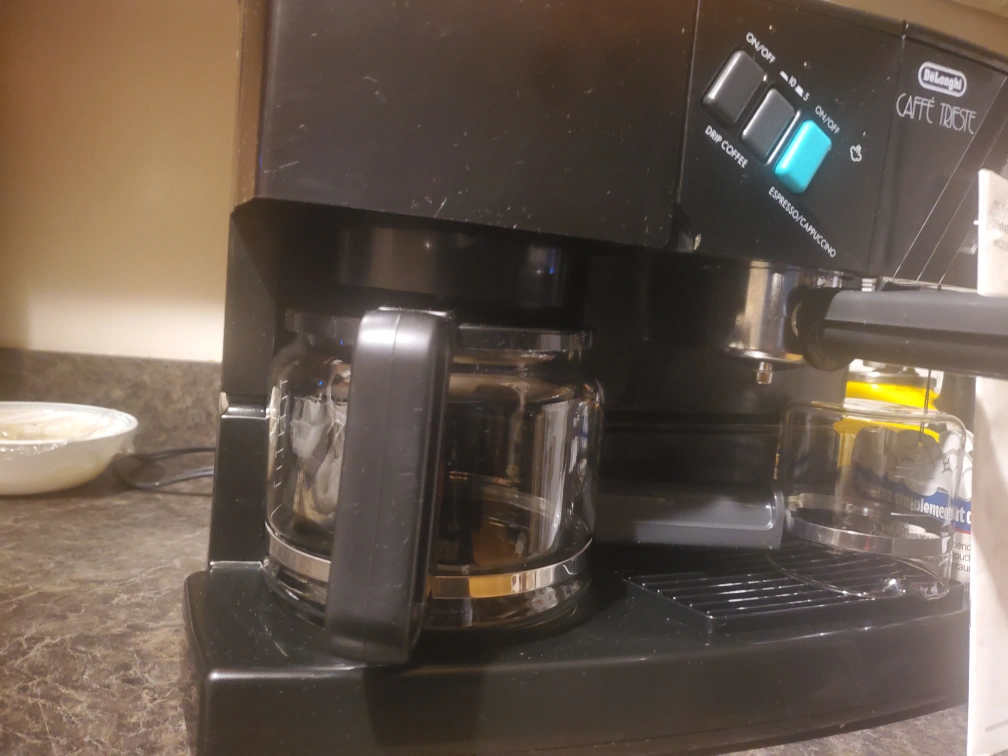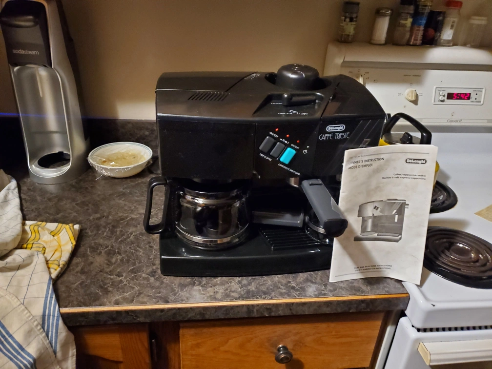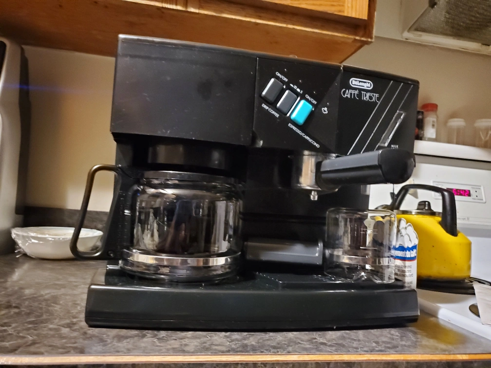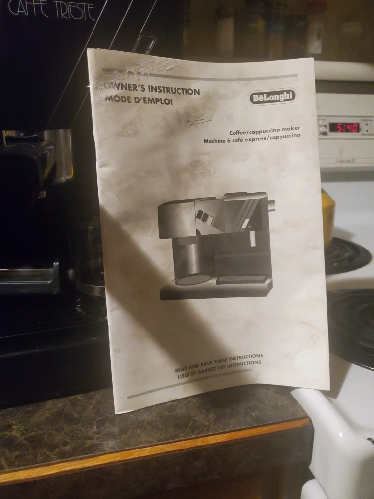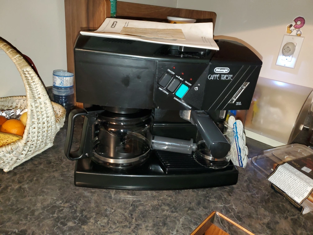 This is a brand new never used. Delonghi Caffe Trieste Espresso Machine with an instruction manual. It makes both espresso and drip coffee. The machine has a removable water tank, drip tray, and a steam wand. It features a light to indicate when the machine is ready.