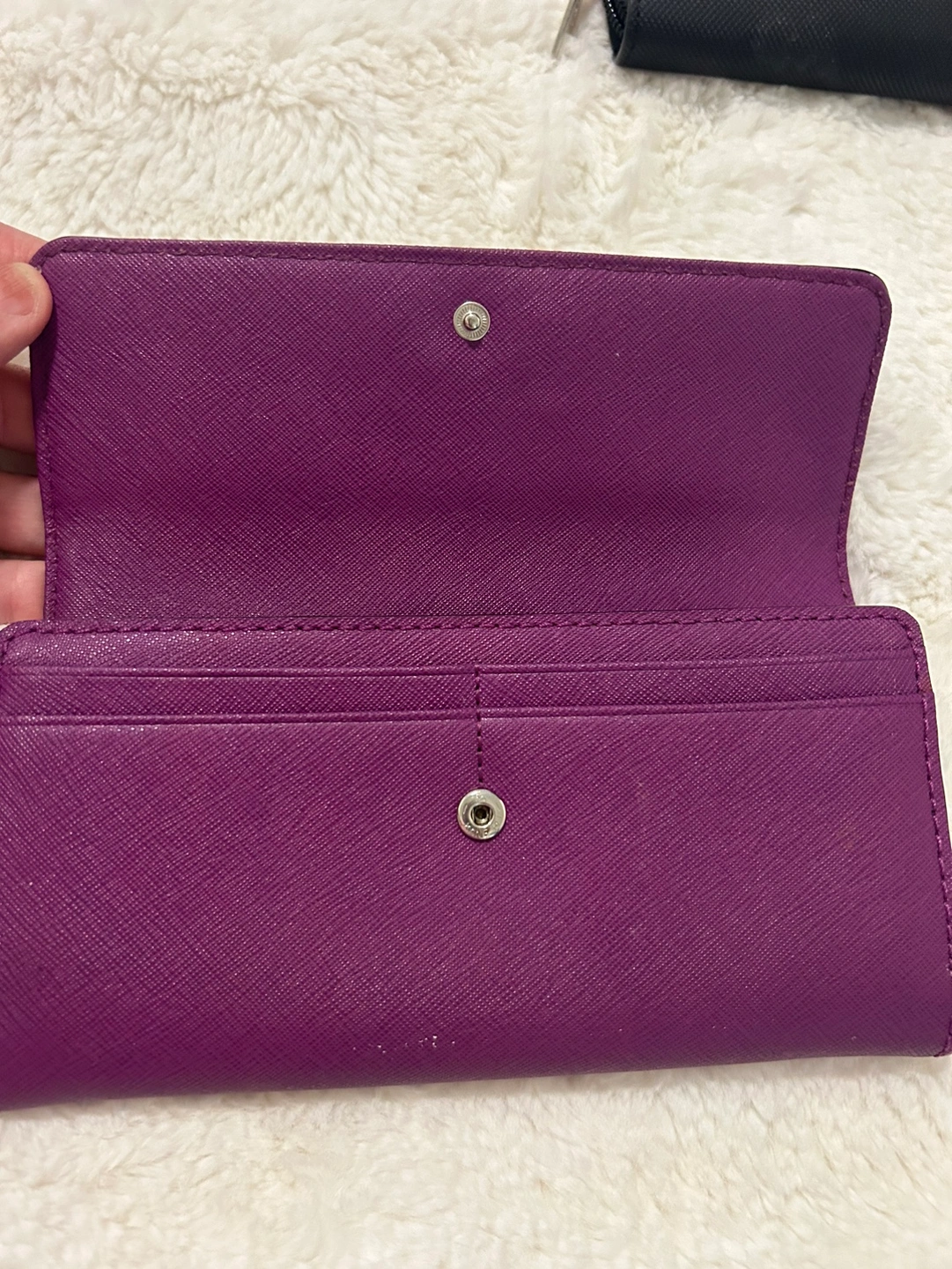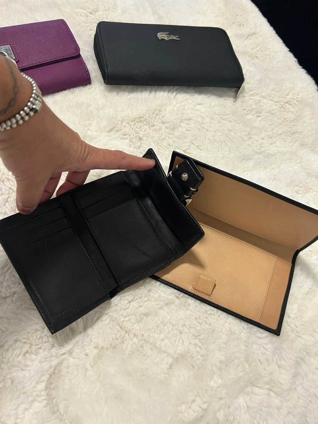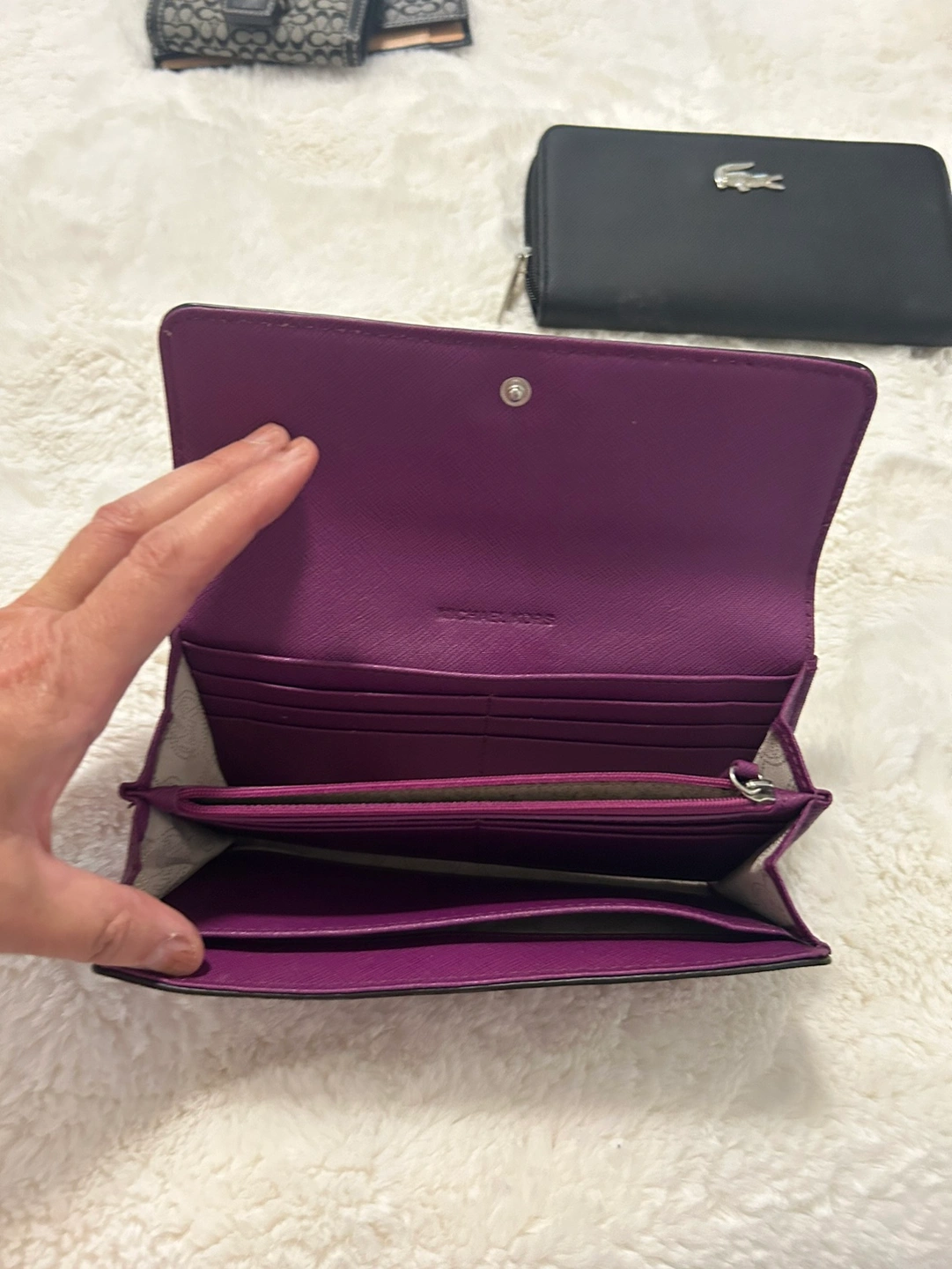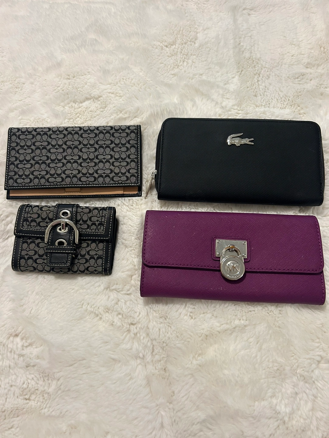 Four designer wallets. Three are long wallets and one is a smaller wallet with a snap closure. The Lacoste wallet is black, the Coach wallets are grey and black, and the Michael Kors wallet is a deep purple.
