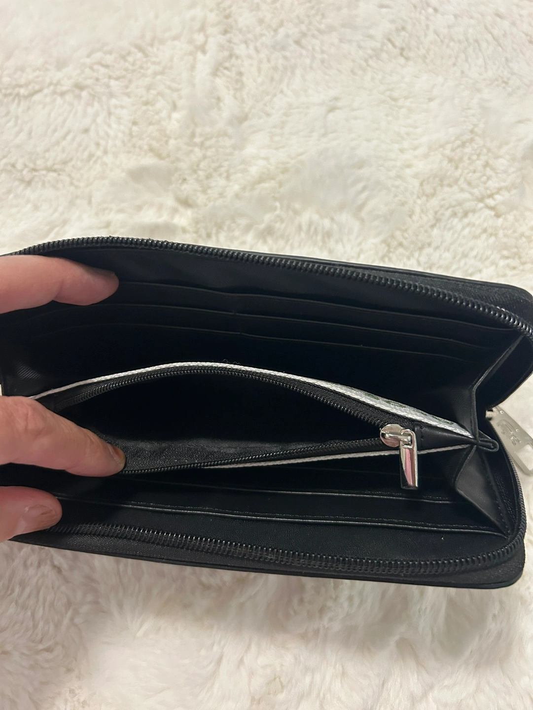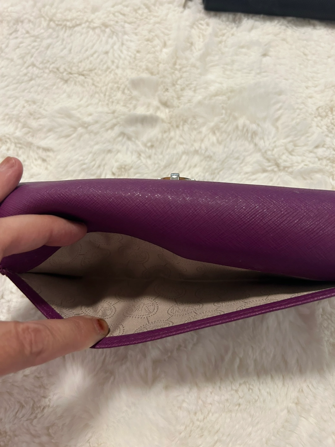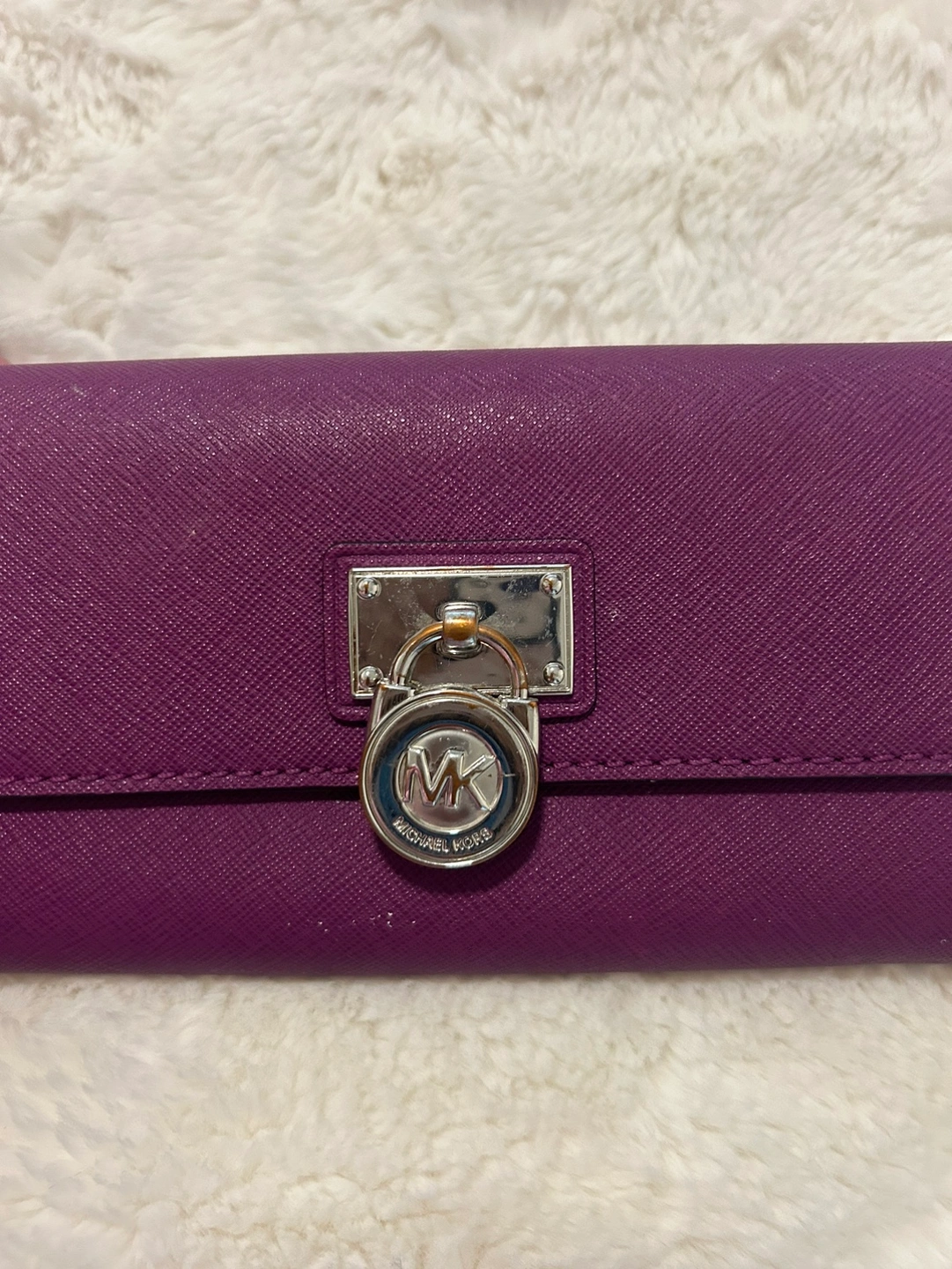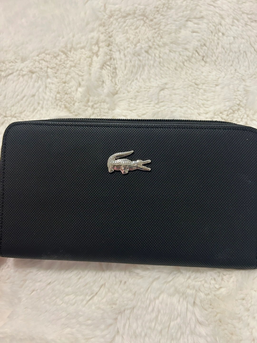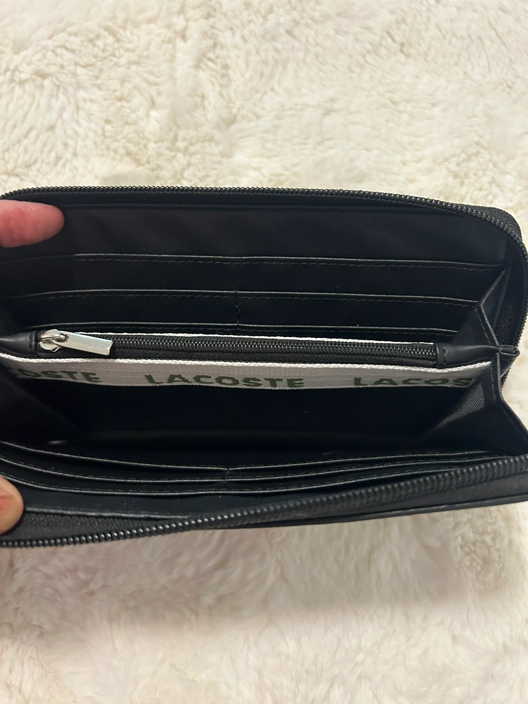 Four designer wallets. Three are long wallets and one is a smaller wallet with a snap closure. The Lacoste wallet is black, the Coach wallets are grey and black, and the Michael Kors wallet is a deep purple.