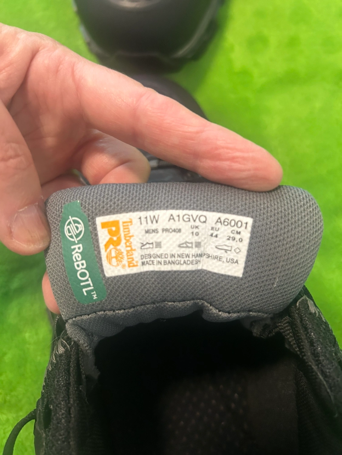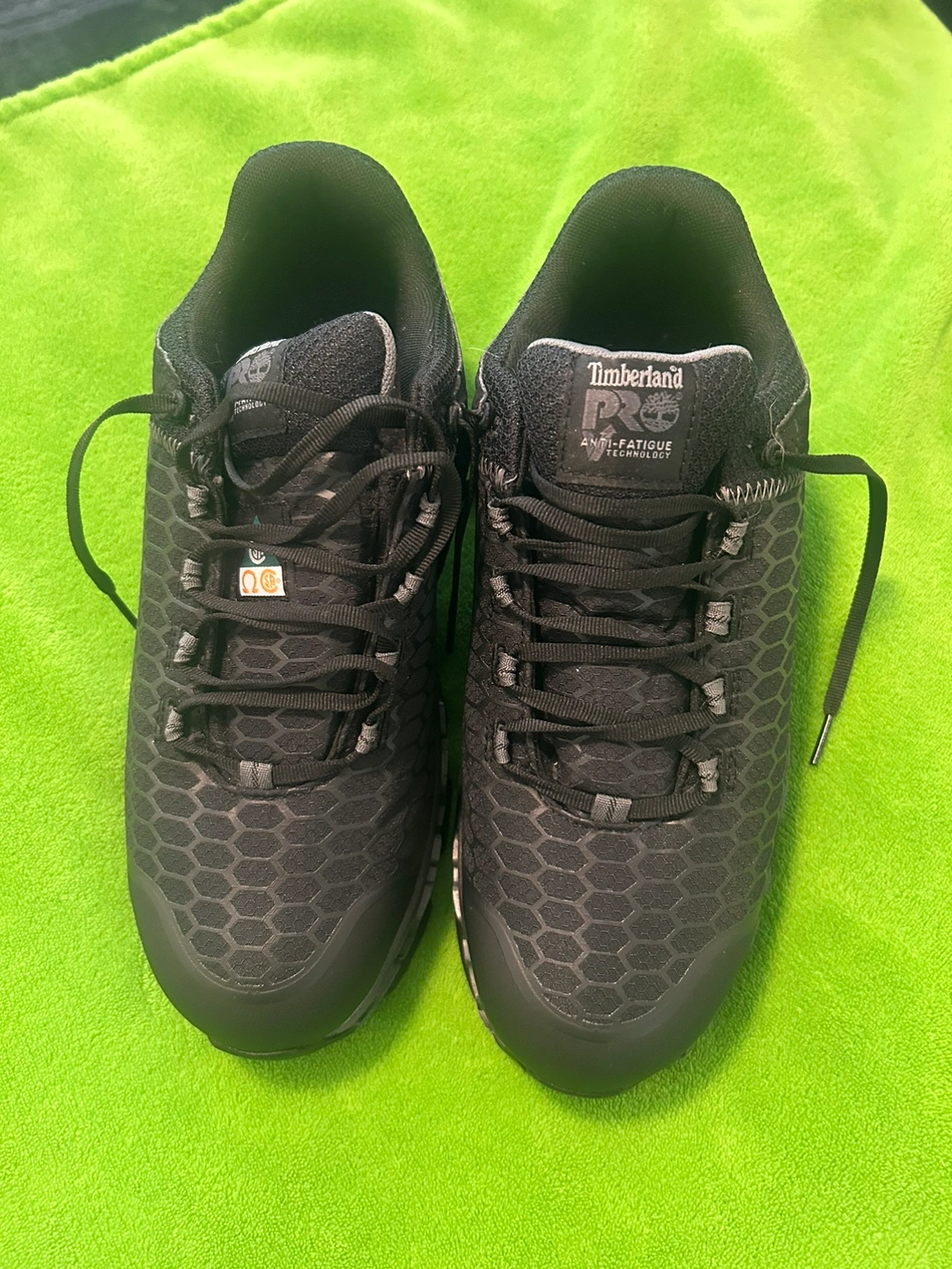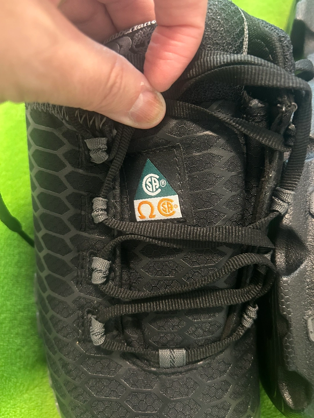 Black work shoes with safety toe and anti-fatigue technology. Size 11 Wide. In good condition.
