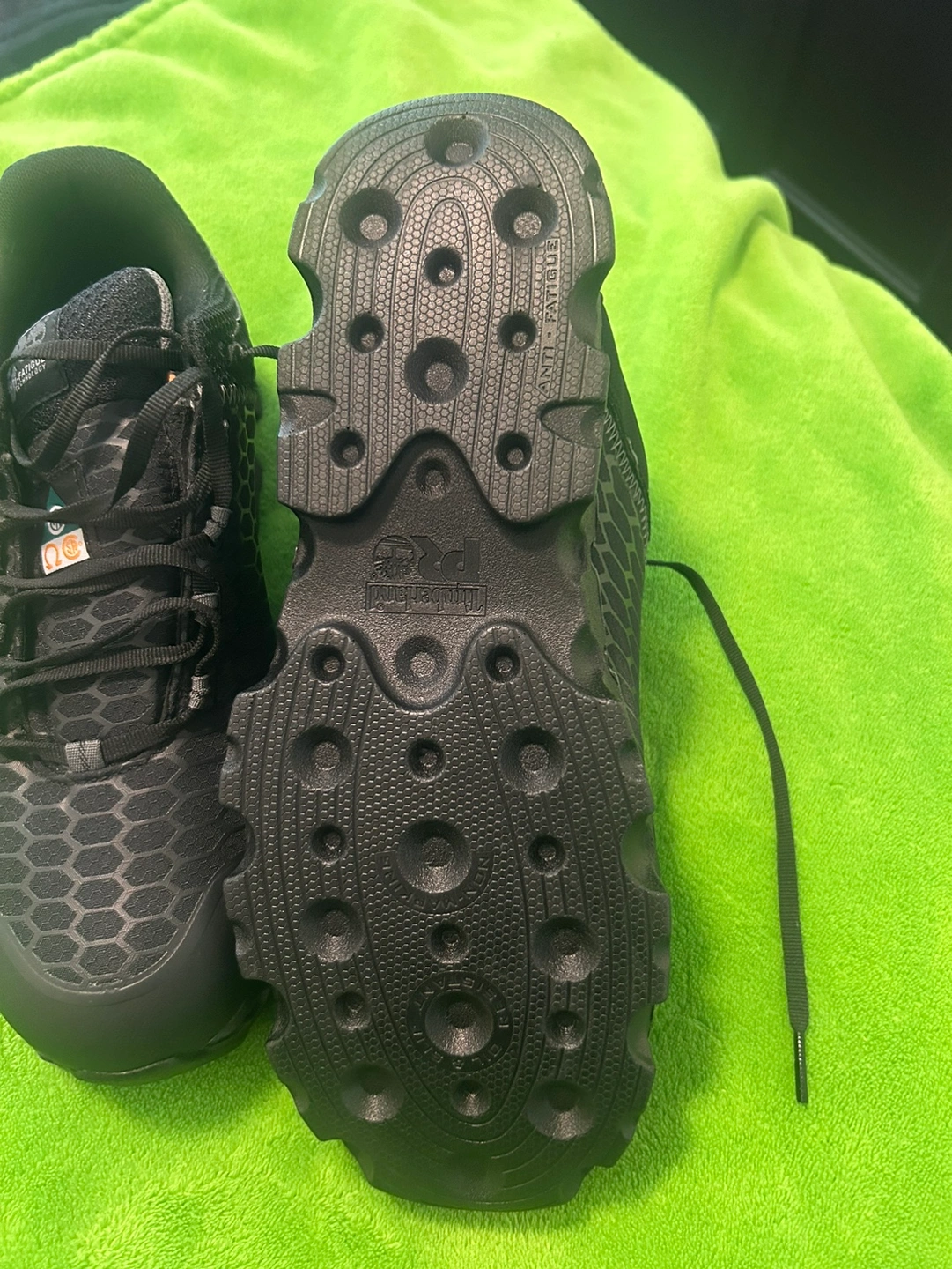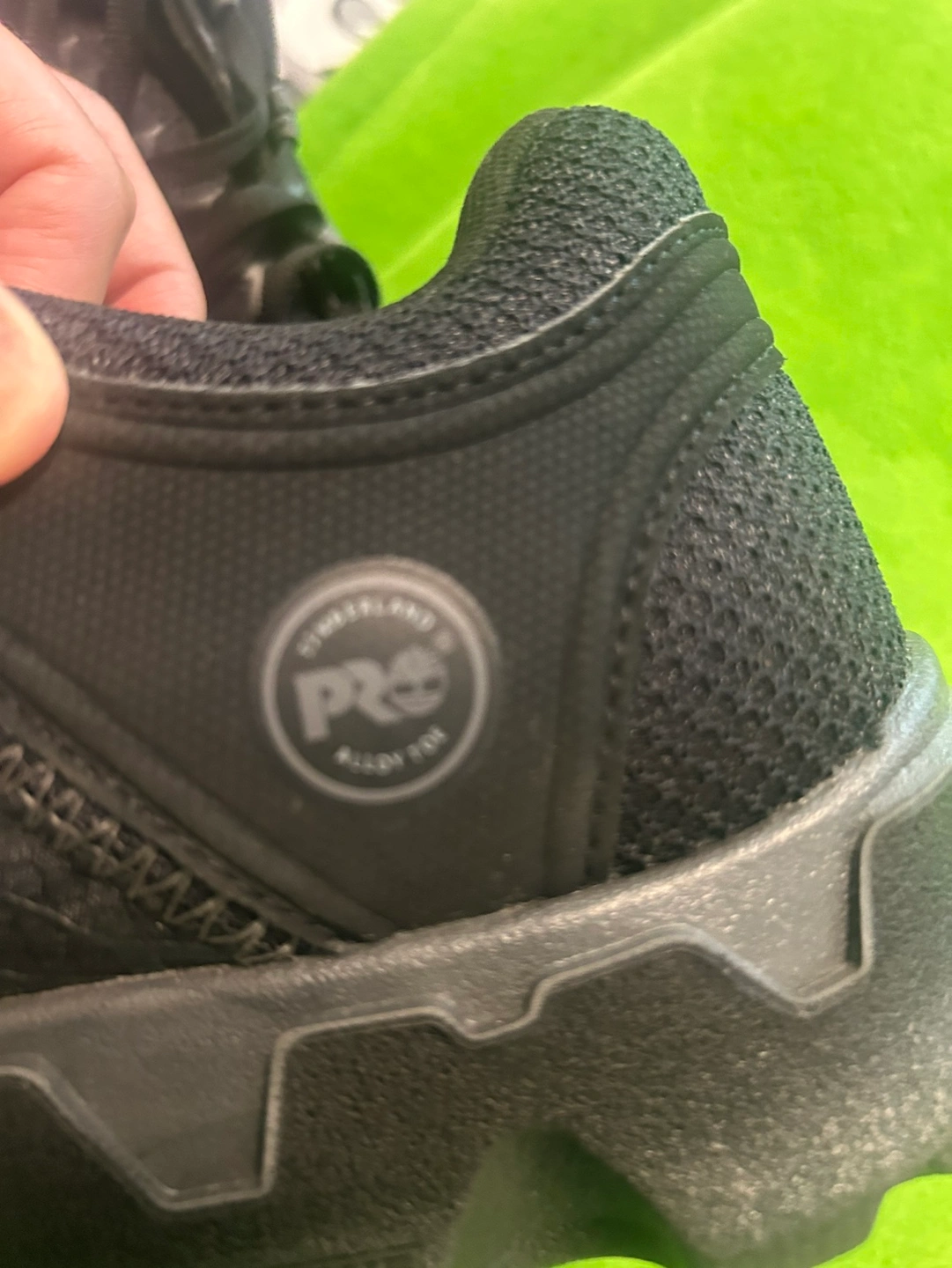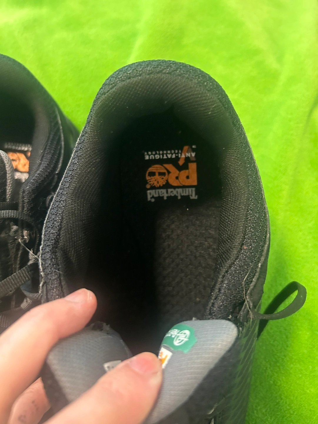 Black work shoes with safety toe and anti-fatigue technology. Size 11 Wide. In good condition.