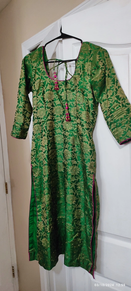 A green kurta with floral embroidery and a pink trim. bust 18.5 waist 16 hip 19 only suit