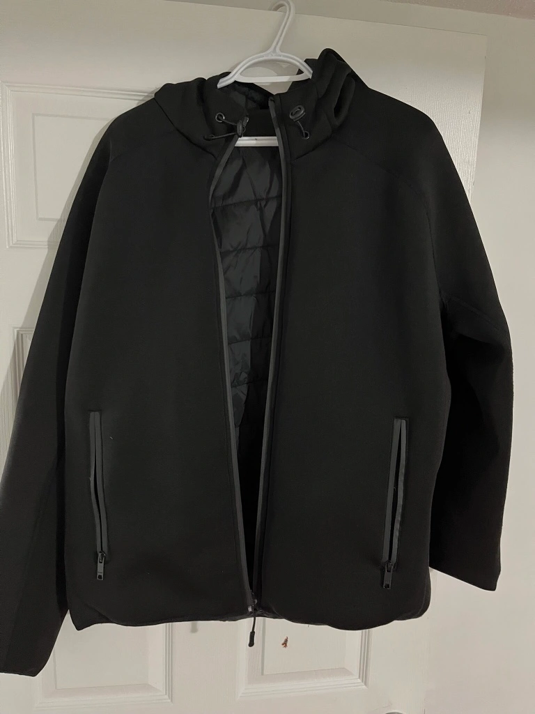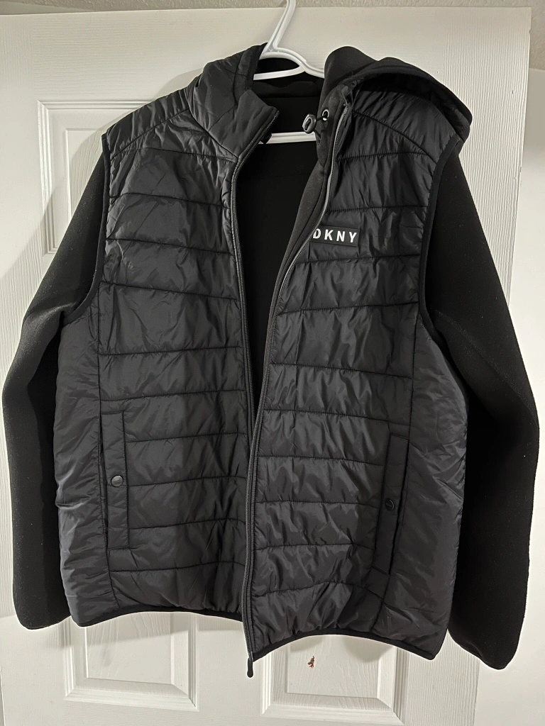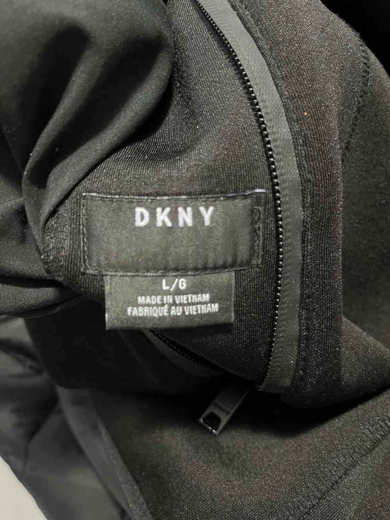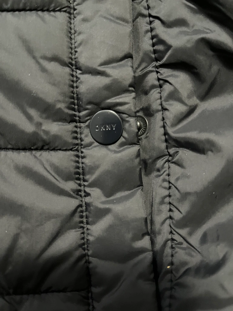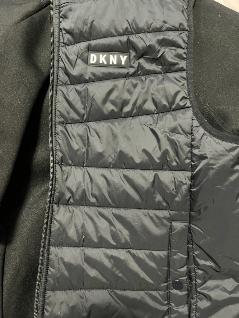 Black DKNY jacket with a zipper closure and a hood. The jacket has a quilted interior and is made from a water-resistant fabric.