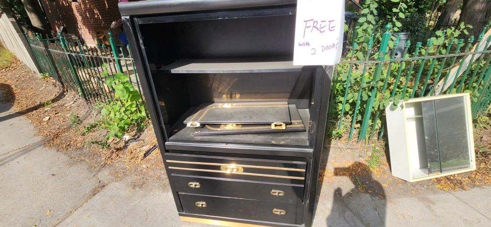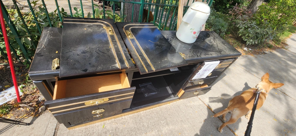 Spotted in front of 2 Empire Ave (Eastern & Carlaw). They are not mine. Just posting them here. This is a black cabinet with gold trim. It has 2 doors that open to reveal shelving, 2 drawers, and a large open space in the middle. There are multiple shelves inside the cabinet.