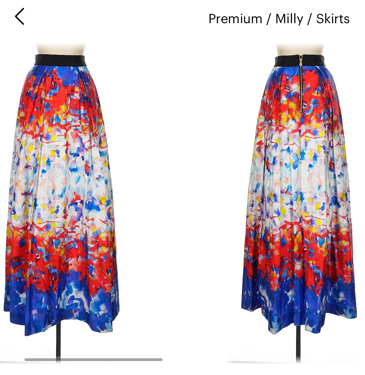 A beautiful, bright, colourful skirt with a flowing silhouette. This skirt is a great option for a special occasion or a night out! The fabric is a blend of silk and rayon. A hidden zipper closure is on the back. It is too small around the waist for me and too long for my 5’2” frame.