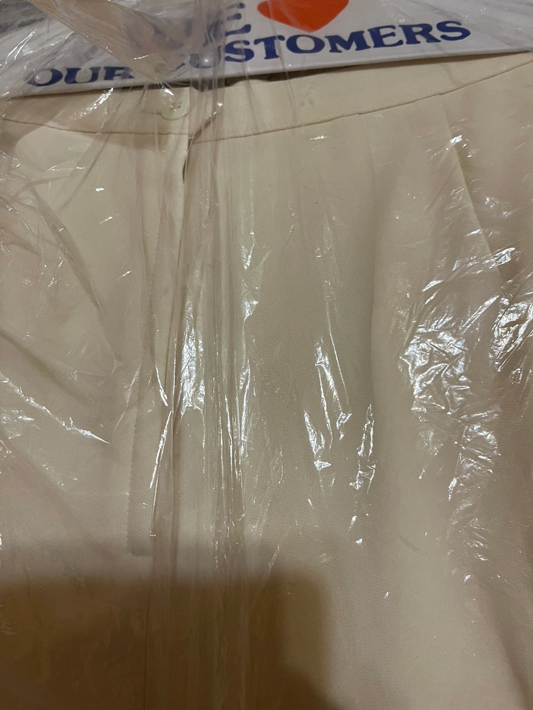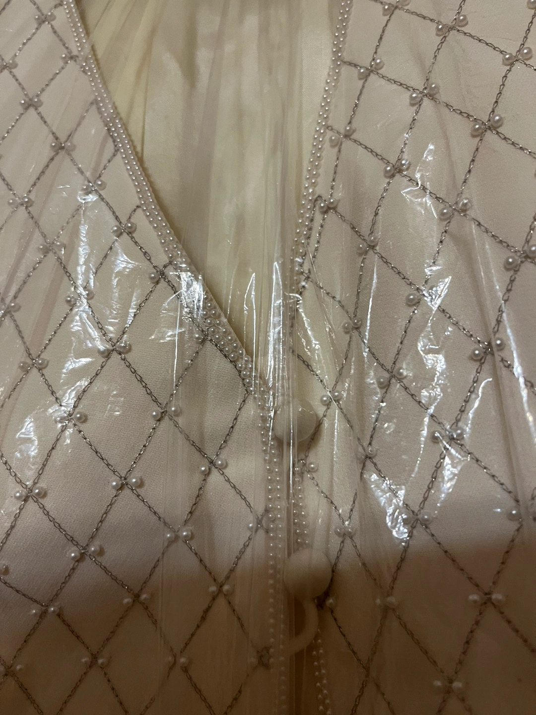 A beautiful white suit with pearl detailing. The jacket has a V-neckline and the skirt. The suit is in good condition. Beige colour.