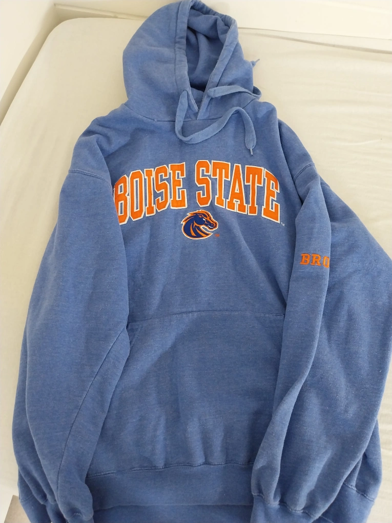 Old Varsity Brand blue hoodie with orange Boise State logo on the front and "Broncos" on one sleeve.