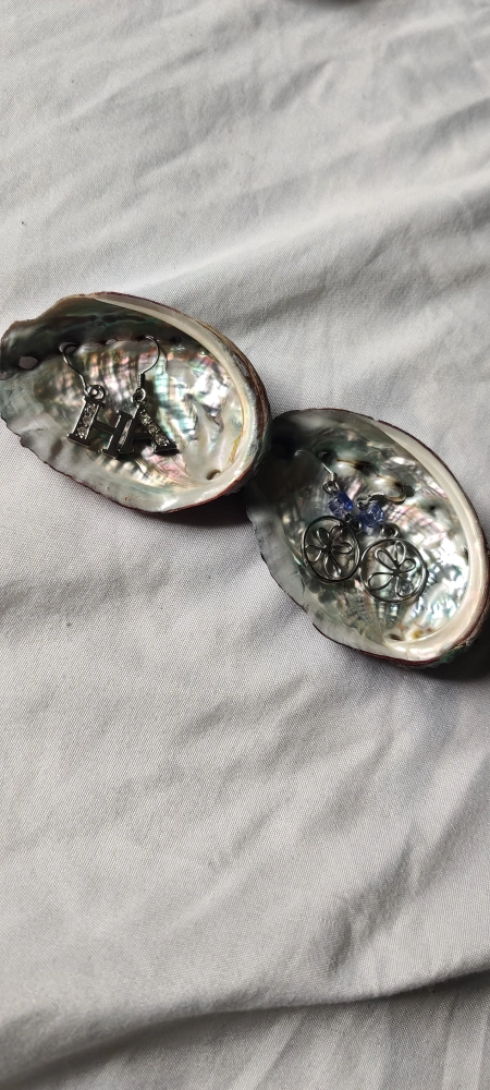 Two pairs of silver earrings: one pair of initial earrings and one pair of floral earrings. Abalone shells included. Pickup from Richmond.