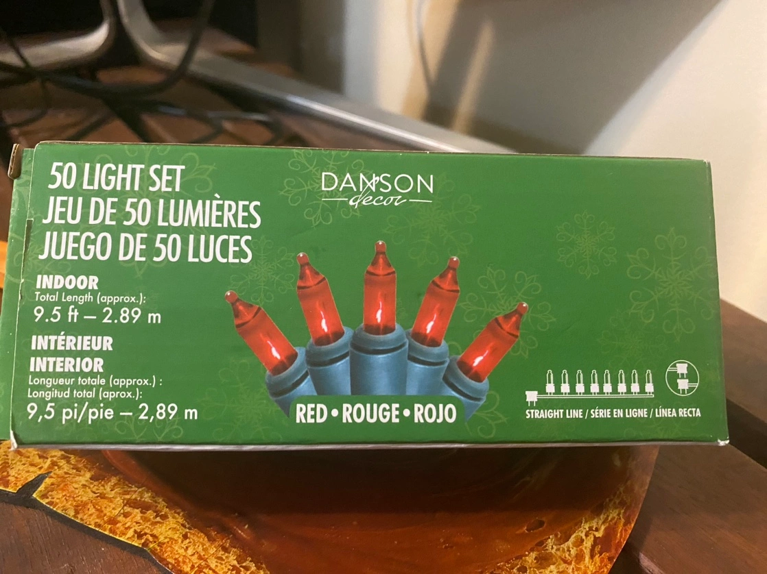 Red 50 light string, 9.5 feet long. Straight line configuration. Indoor use.