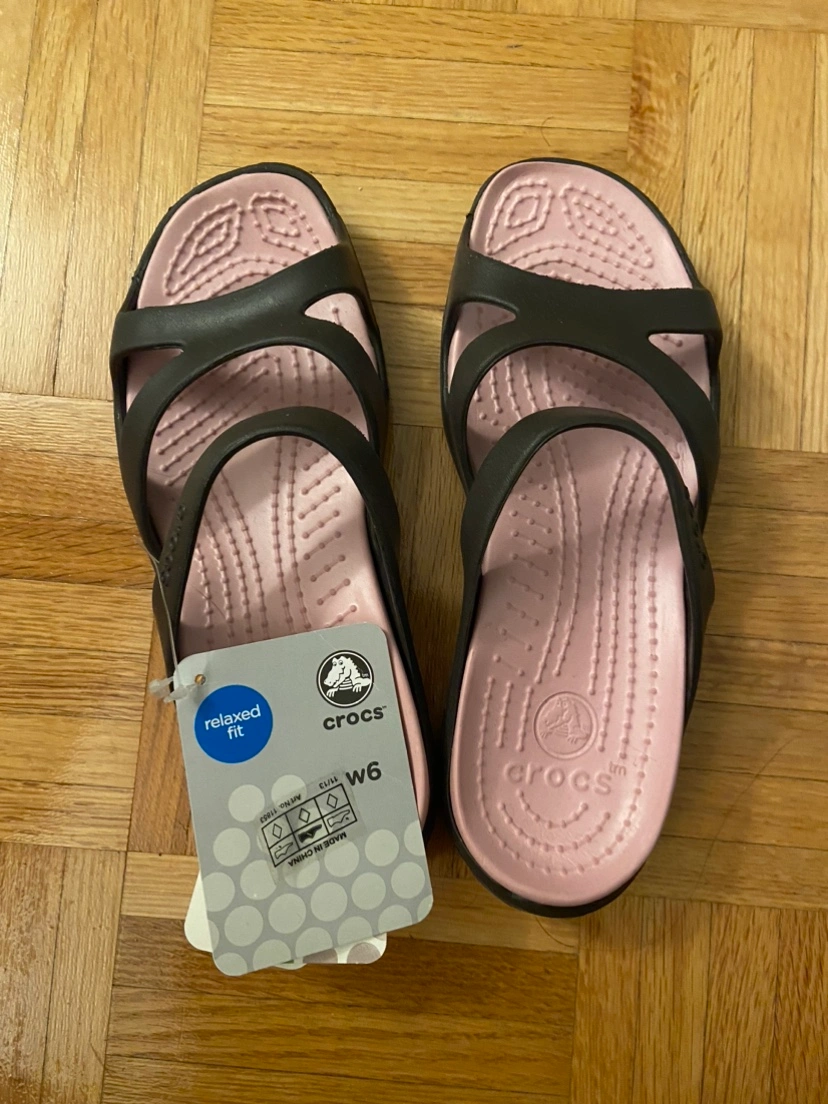Brown and pink women's sandals. Size W6. "Relaxed fit" Crocs brand.