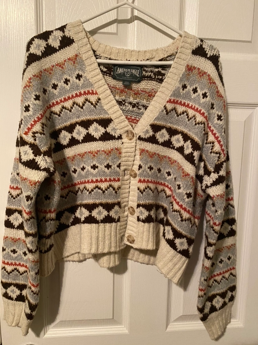 Long sleeves, cream, burgundy & gray patterned cardigan with button closure Cash only
