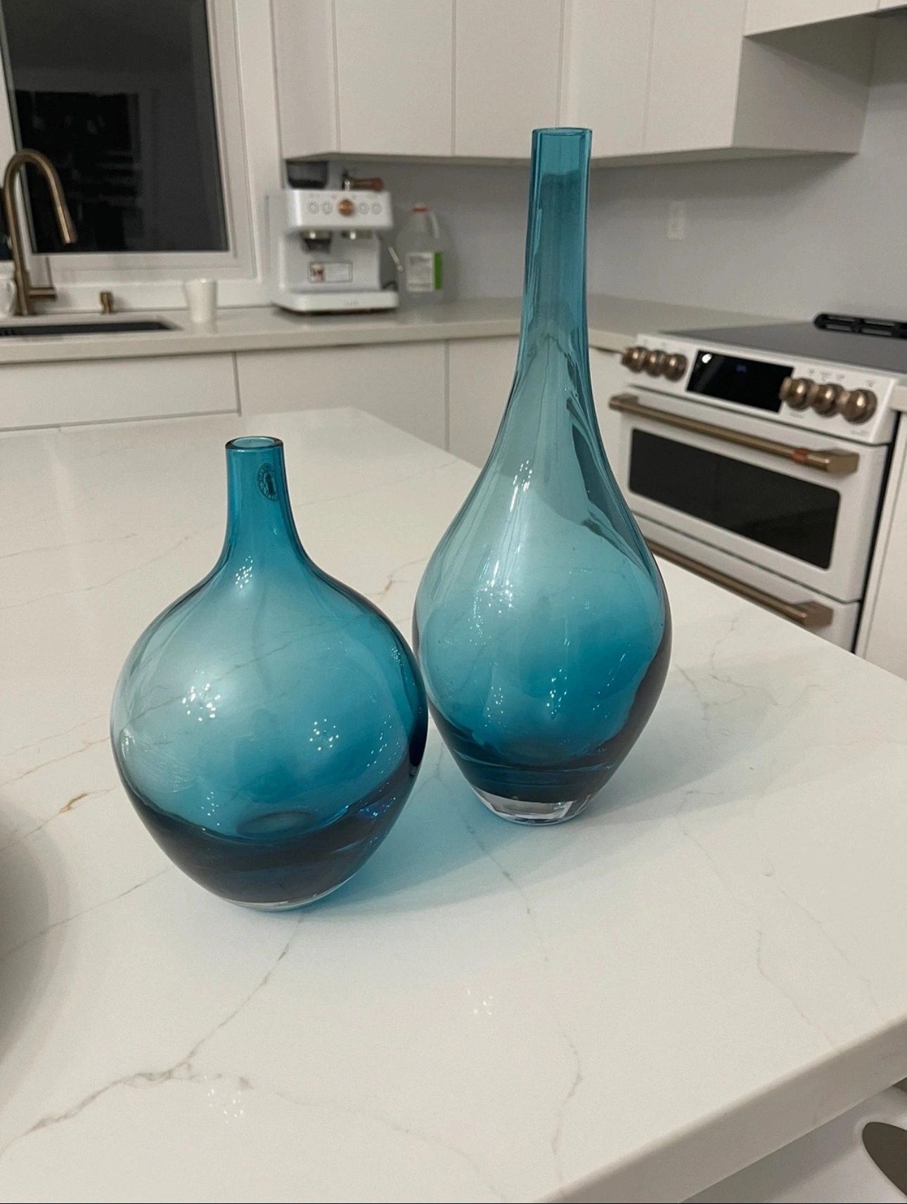 Two teal glass vases, one taller and one shorter. Both are in a teardrop shape.