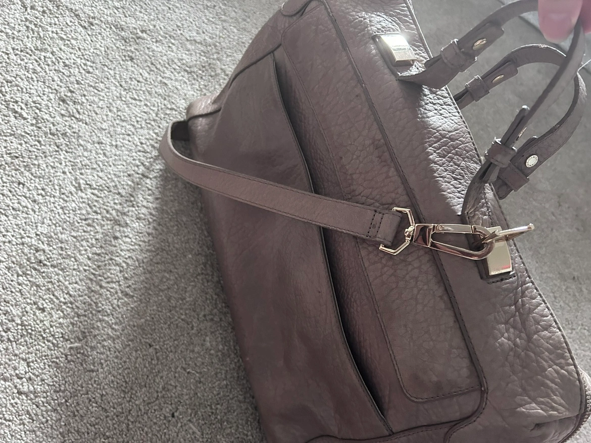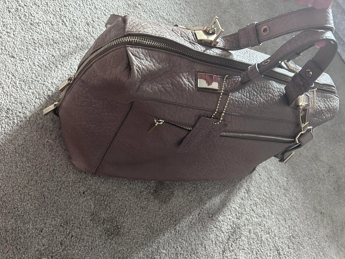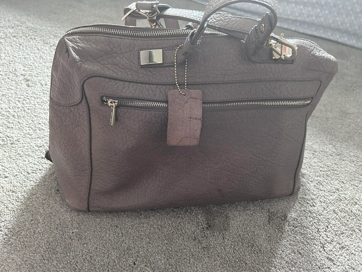 Grey leather bag with multiple zippered compartments. Has an adjustable strap, allowing the bag to be worn as a shoulder bag or a crossbody. Can be used as a carry on or a weekend bag.