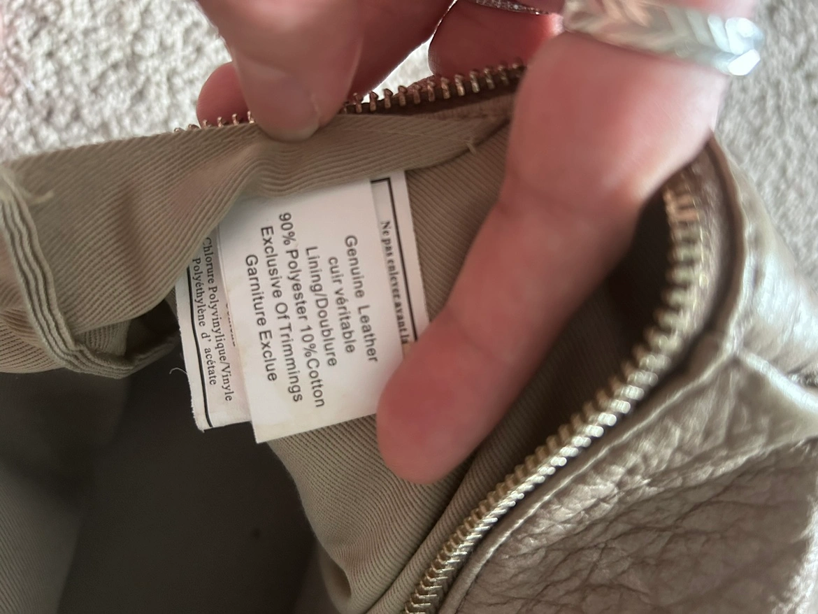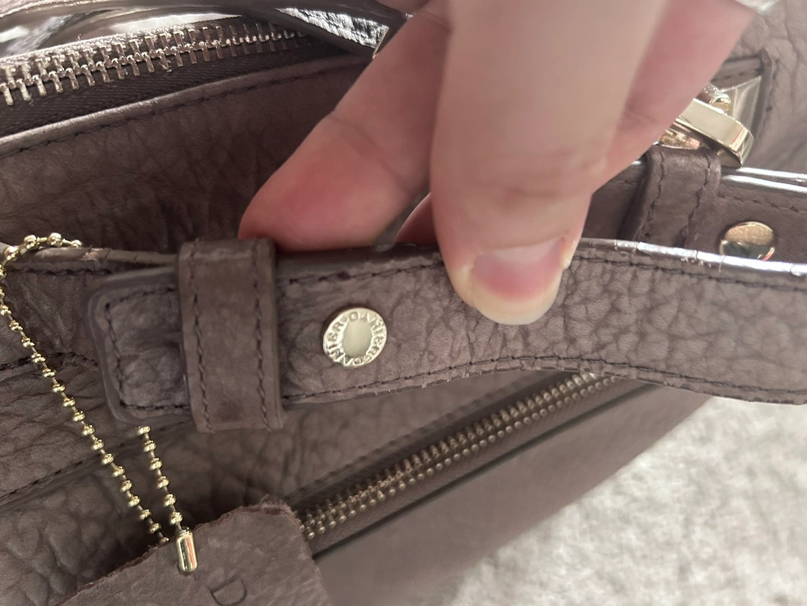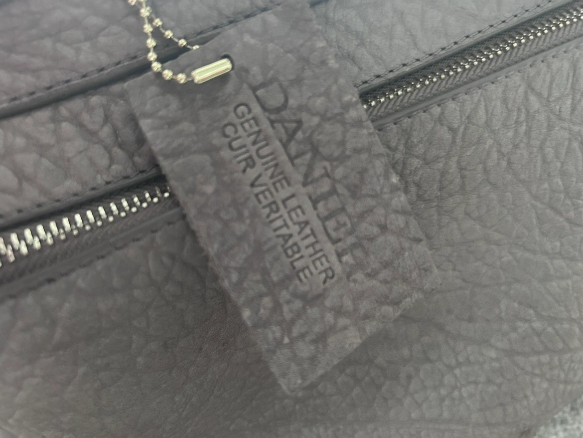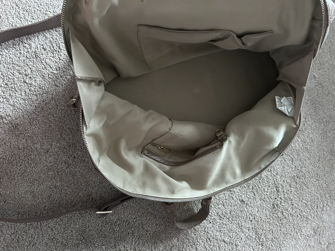 Grey leather bag with multiple zippered compartments. Has an adjustable strap, allowing the bag to be worn as a shoulder bag or a crossbody. Can be used as a carry on or a weekend bag.