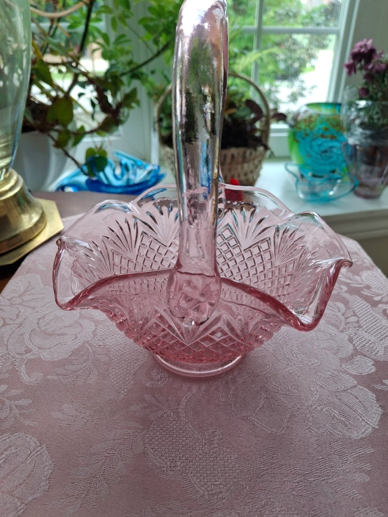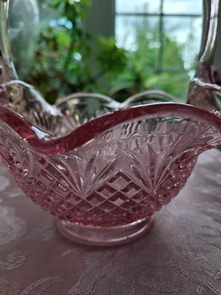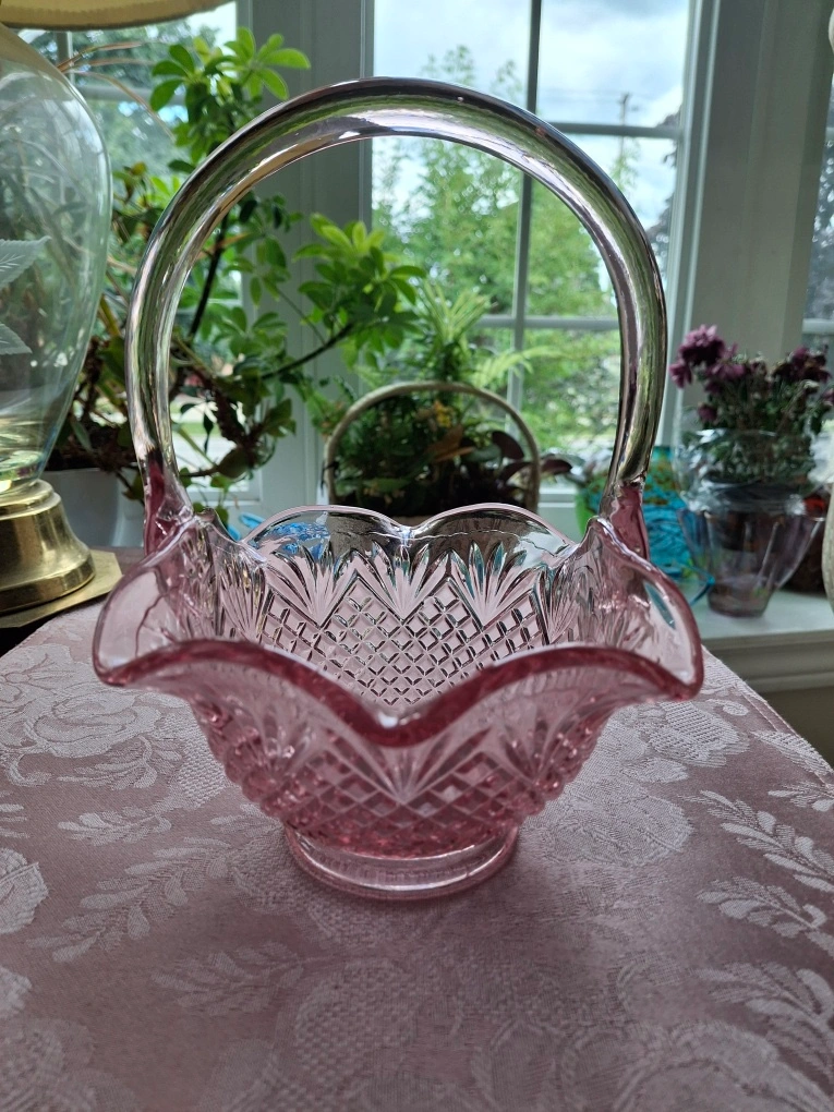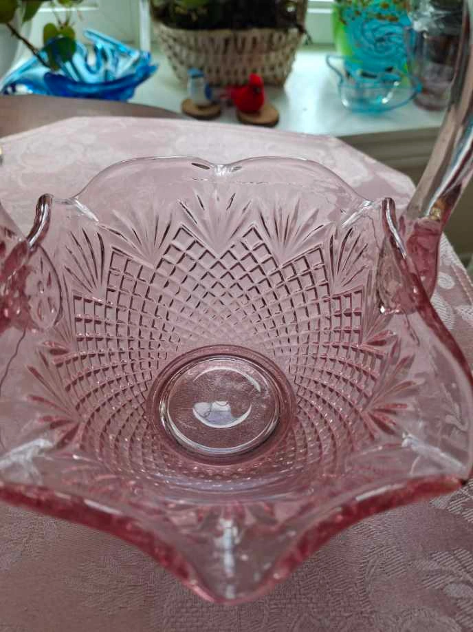 Vintage pink fluted glass basket with a handle. It has a beautiful cut glass design. 7” x 5”, and 8” tall to top of handle. Available for pickup in Markland Wood.