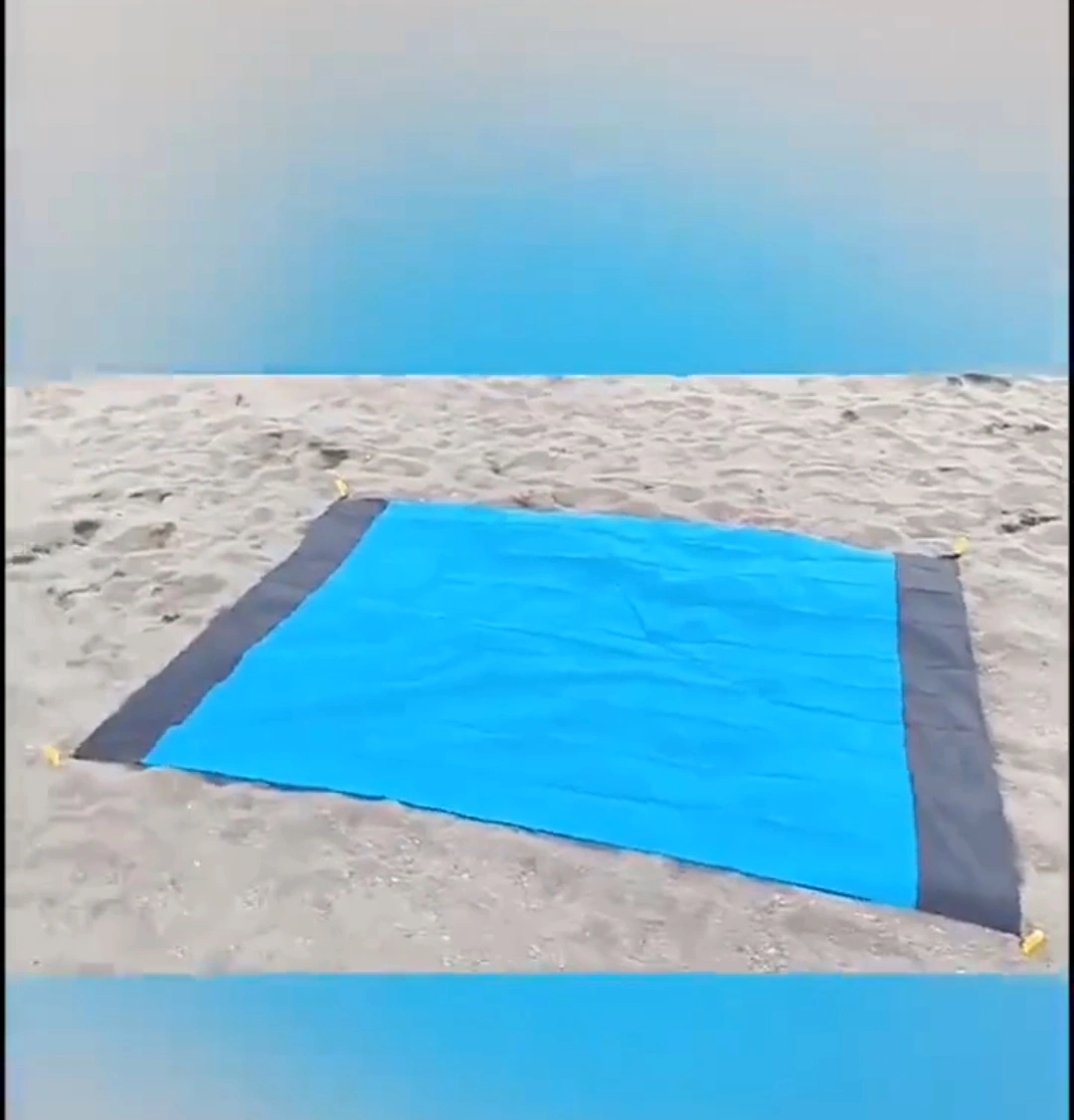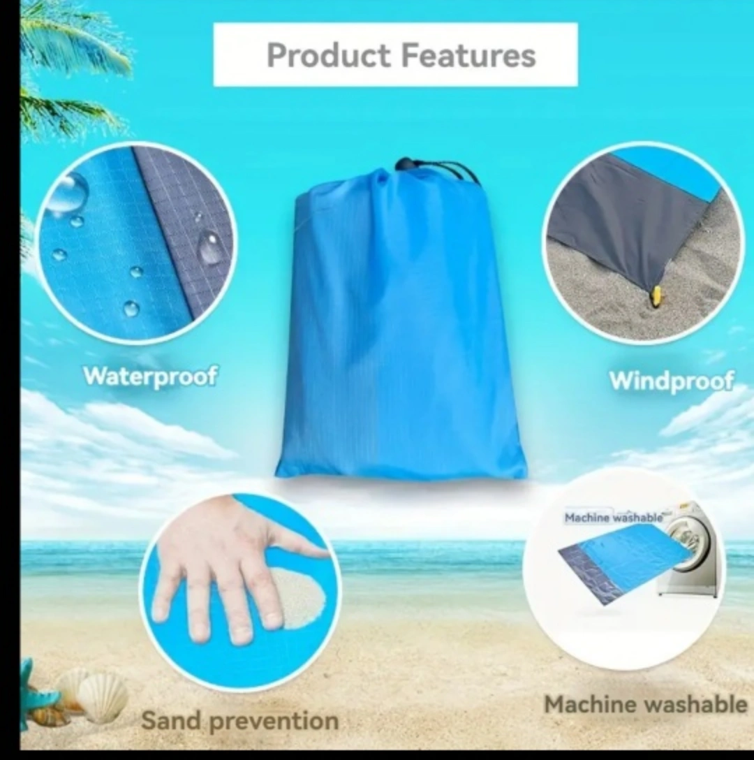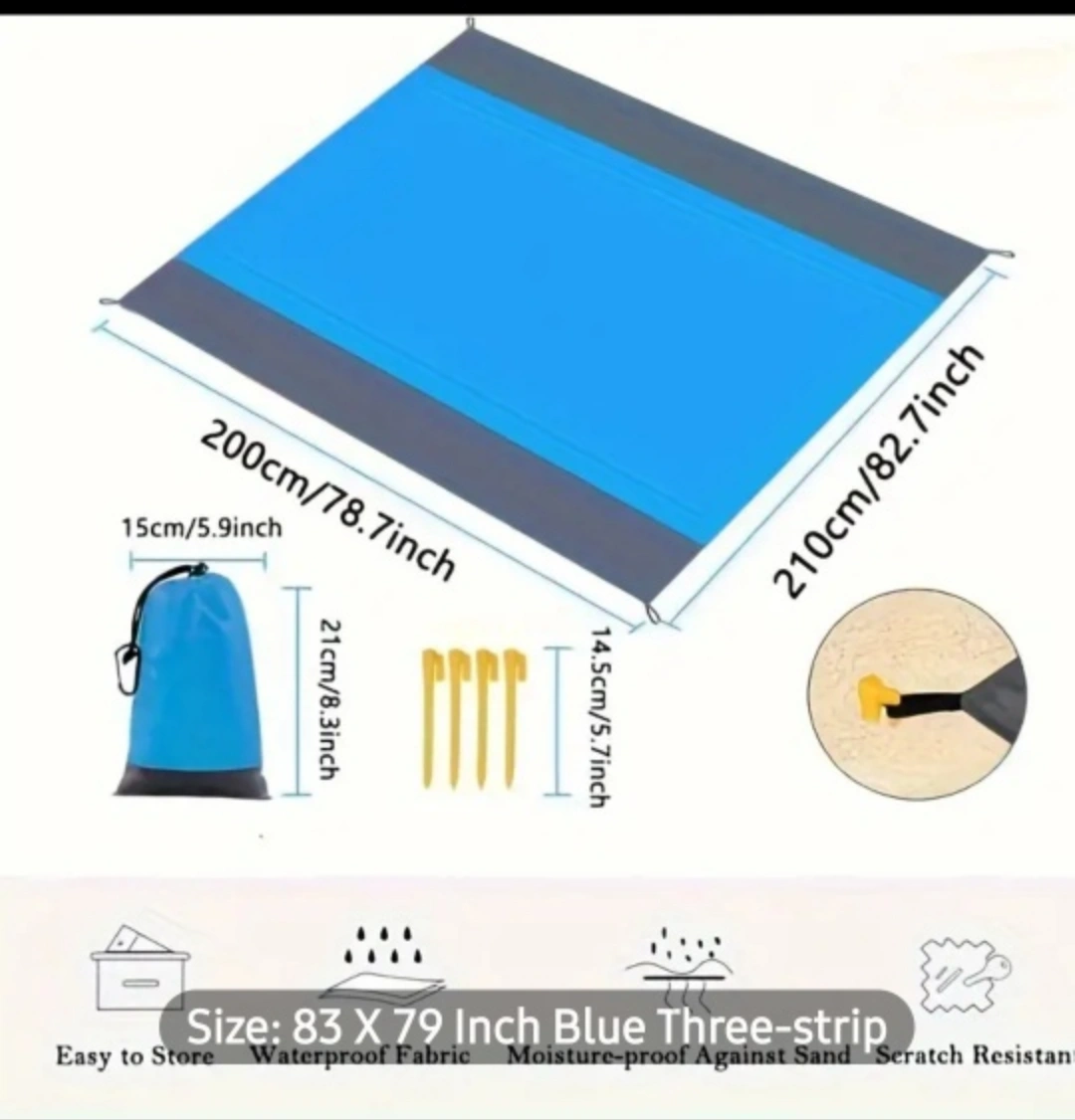 A waterproof, windproof, and sandproof blanket for the beach or other outdoor activities. Includes stakes and a carrying pouch. easy to carry hand or machine wash. takez very less space like mobile phone.
