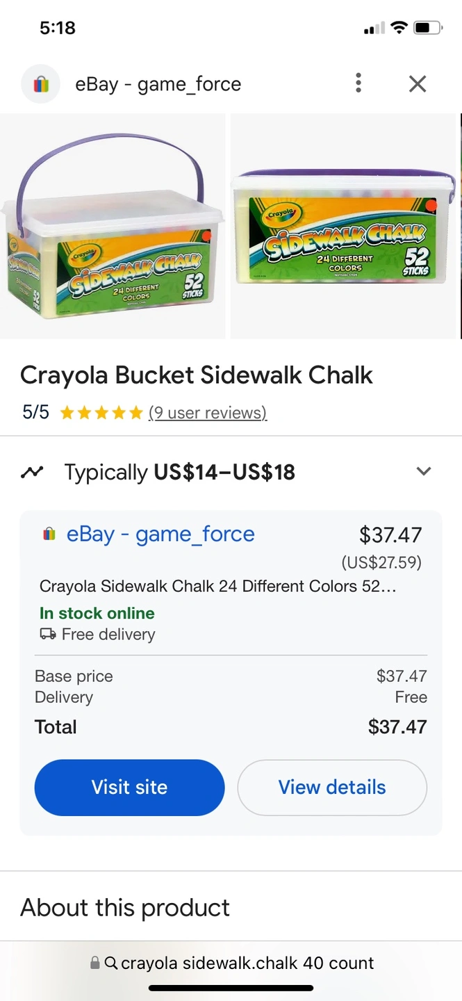 Crayola Sidewalk Large Chalk 40 Pack-NEW sealed container (Similar items selling online for over $25 a see attached photo for price comparison) Moving sale - non smoking & no pet household