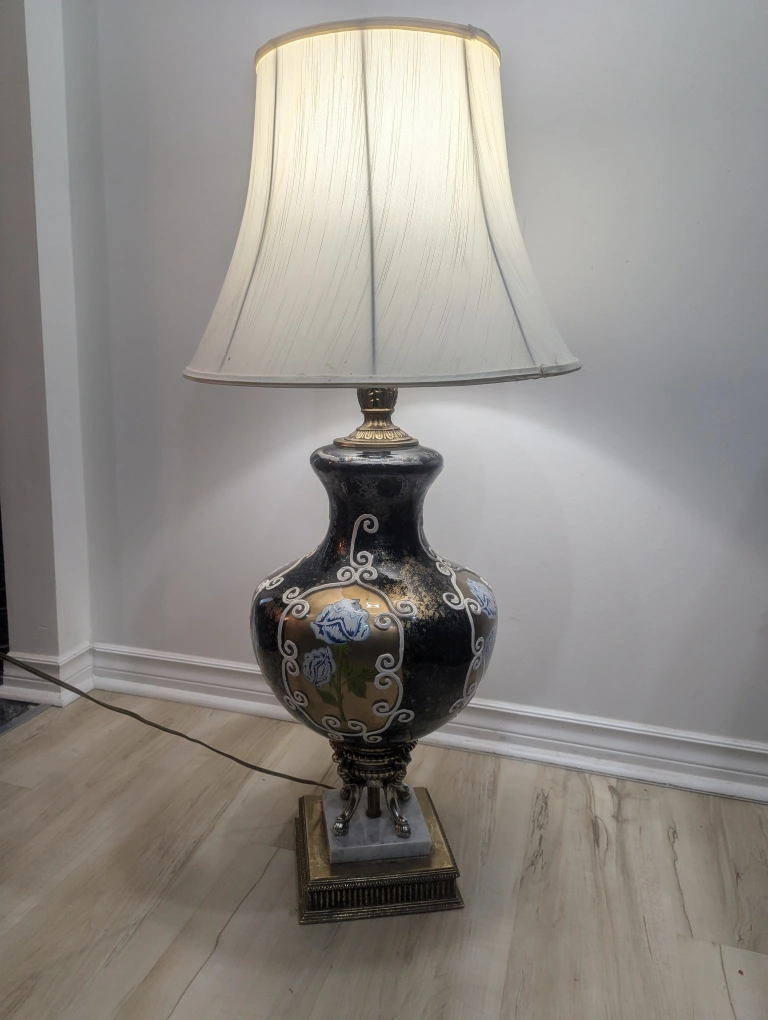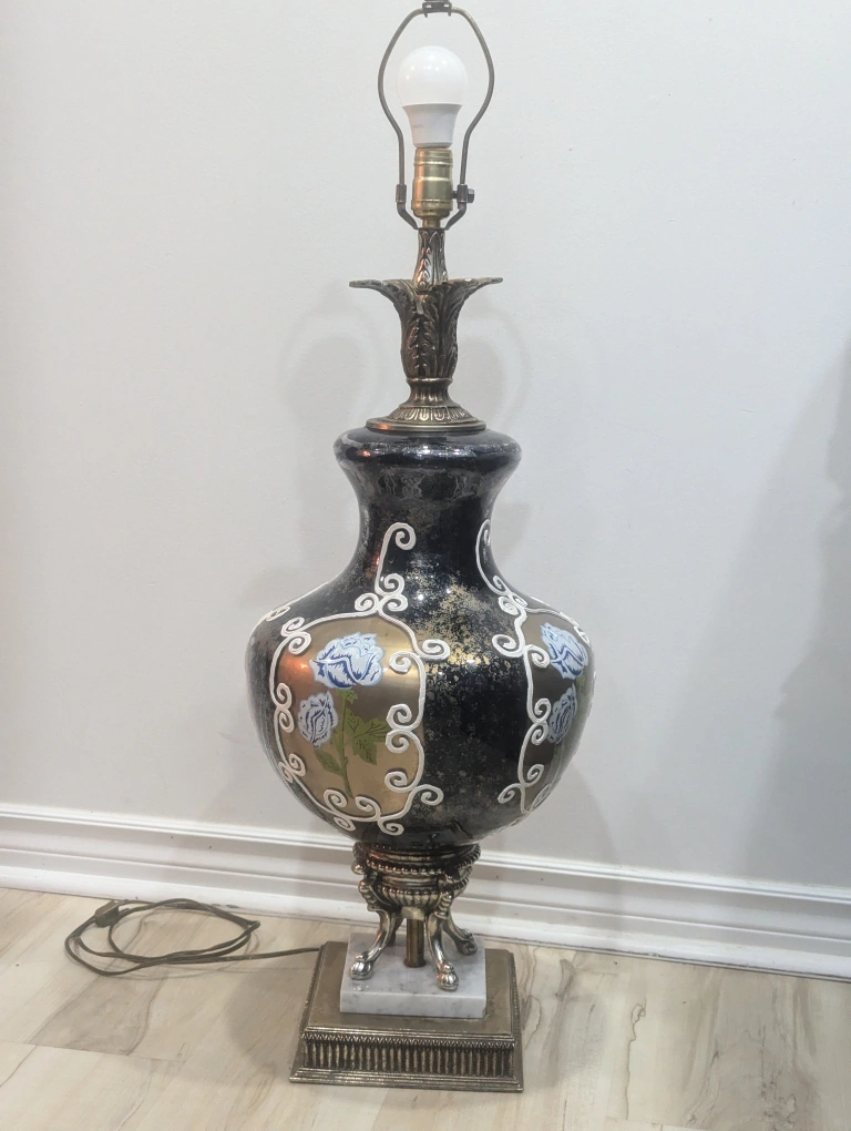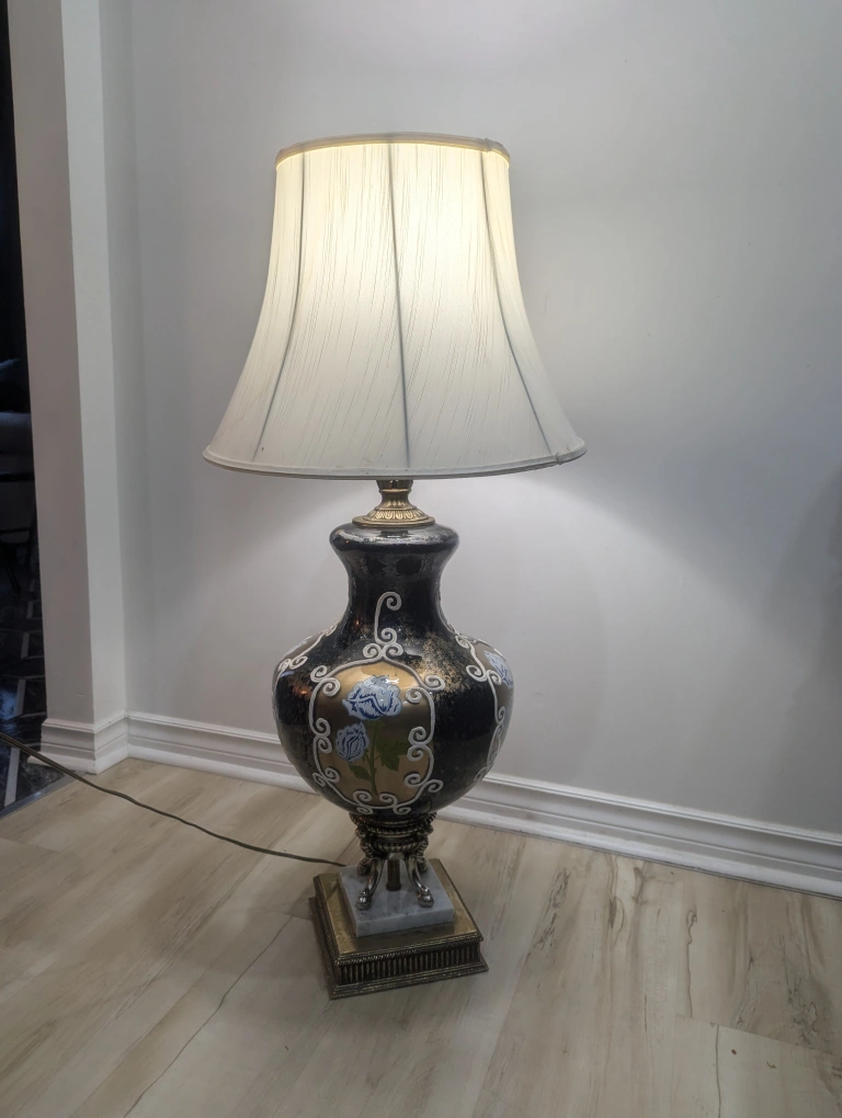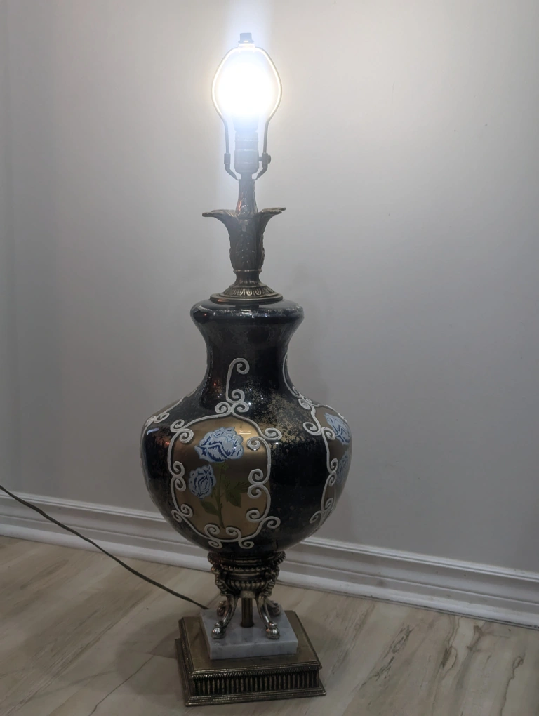 A large, 37" high hand-painted porcelain floral piece with a marble and brass base. It's in beautiful working condition with no chips or cracks.