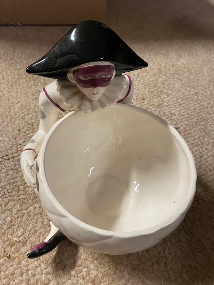 A ceramic bowl in the shape of a clown. The bowl is white with grey and red accents. The clown is wearing a black hat and a purple mask.one hand fingers broken otherwise everything is good #π₯
