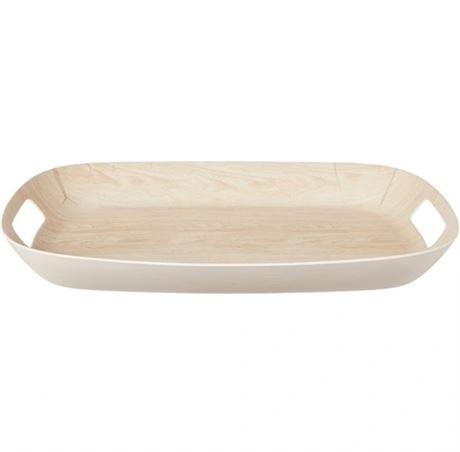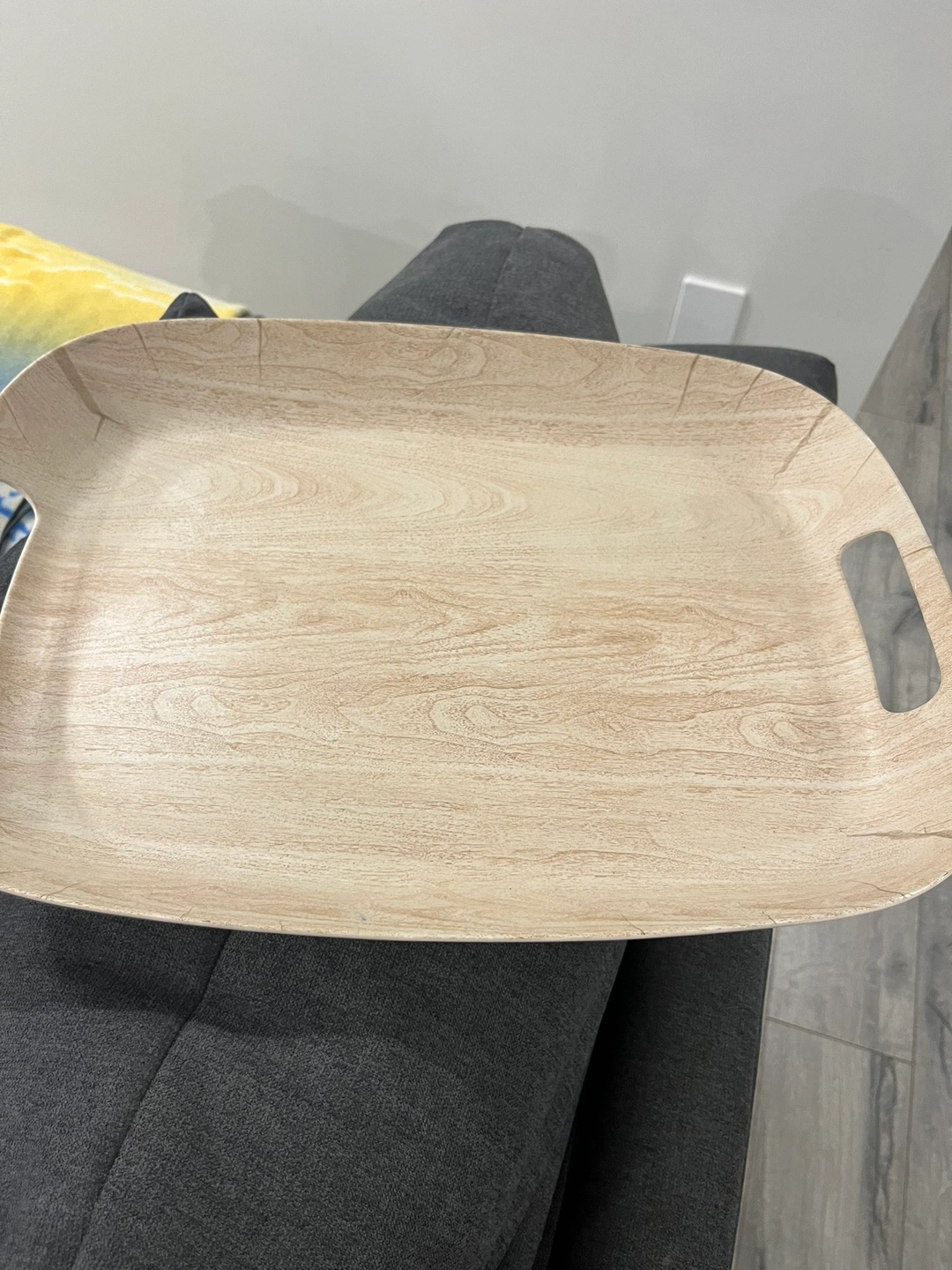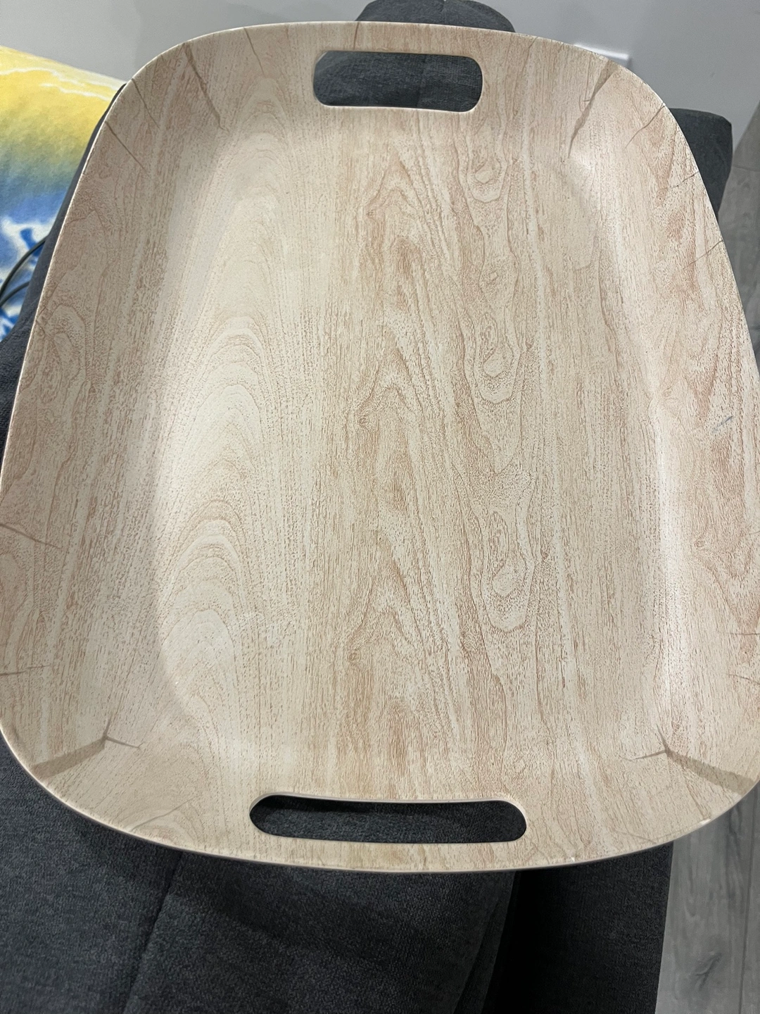 This serving tray has two handles on each side. It is a rectangular shape. The tray is light beige in colour and has a wood grain print. Pickup Yorkdale Mall