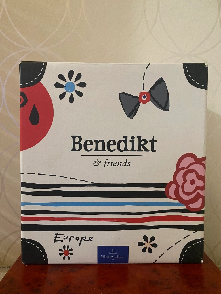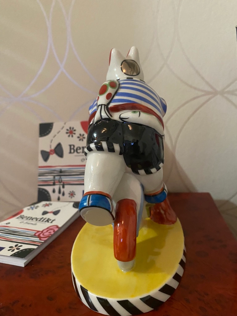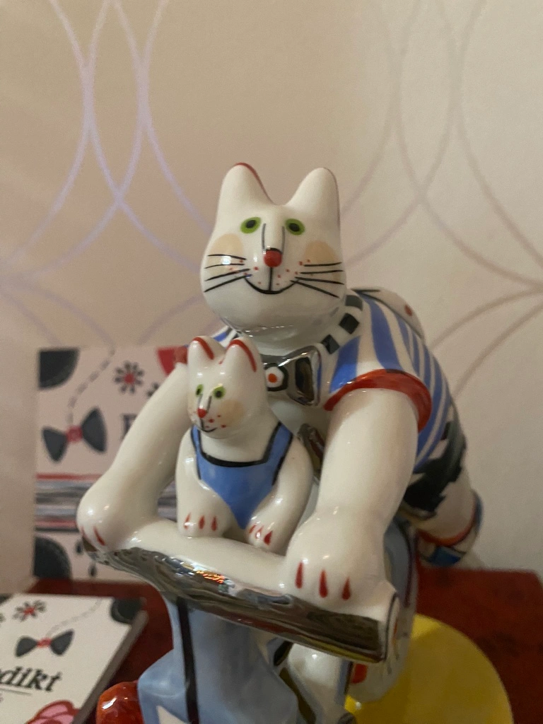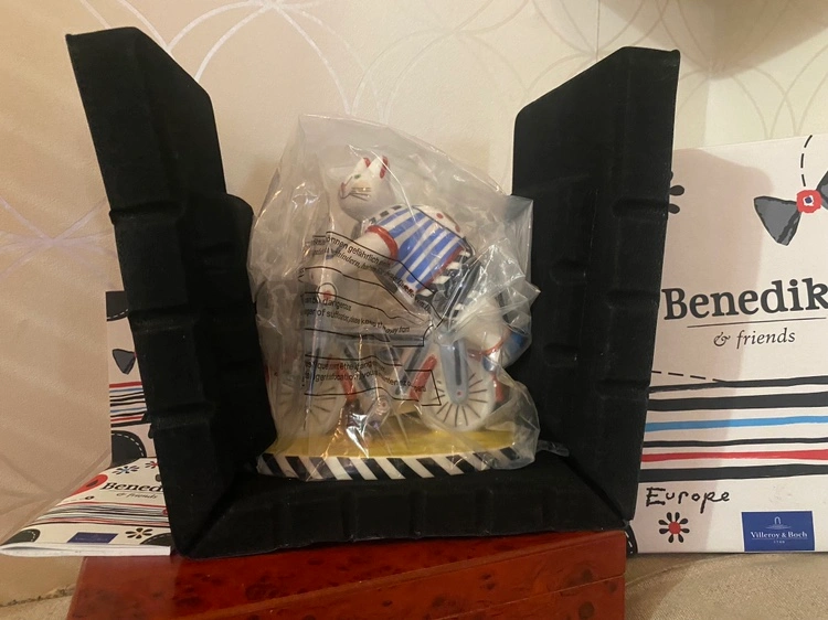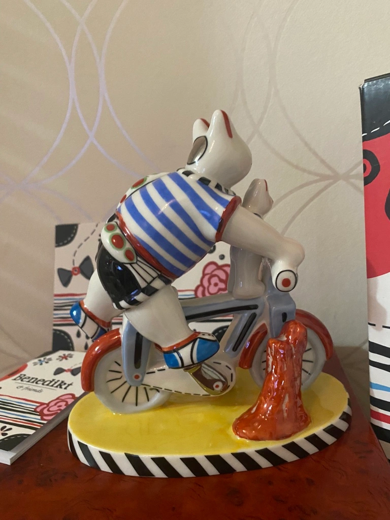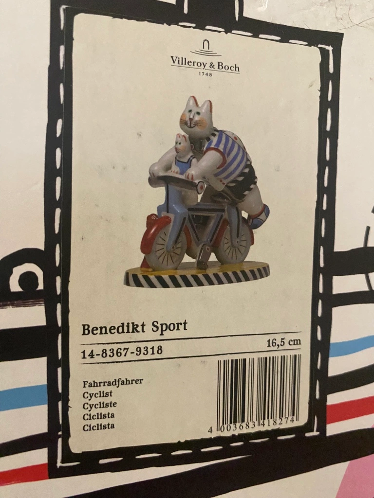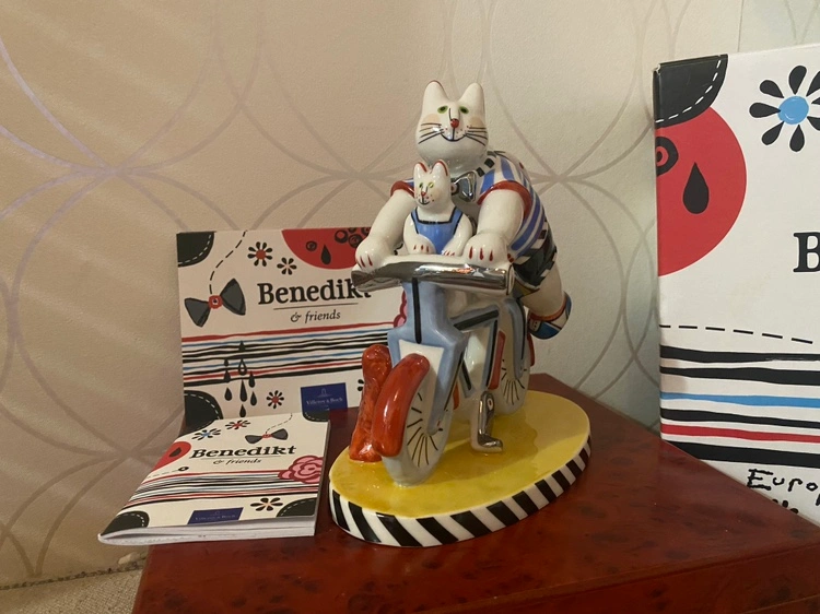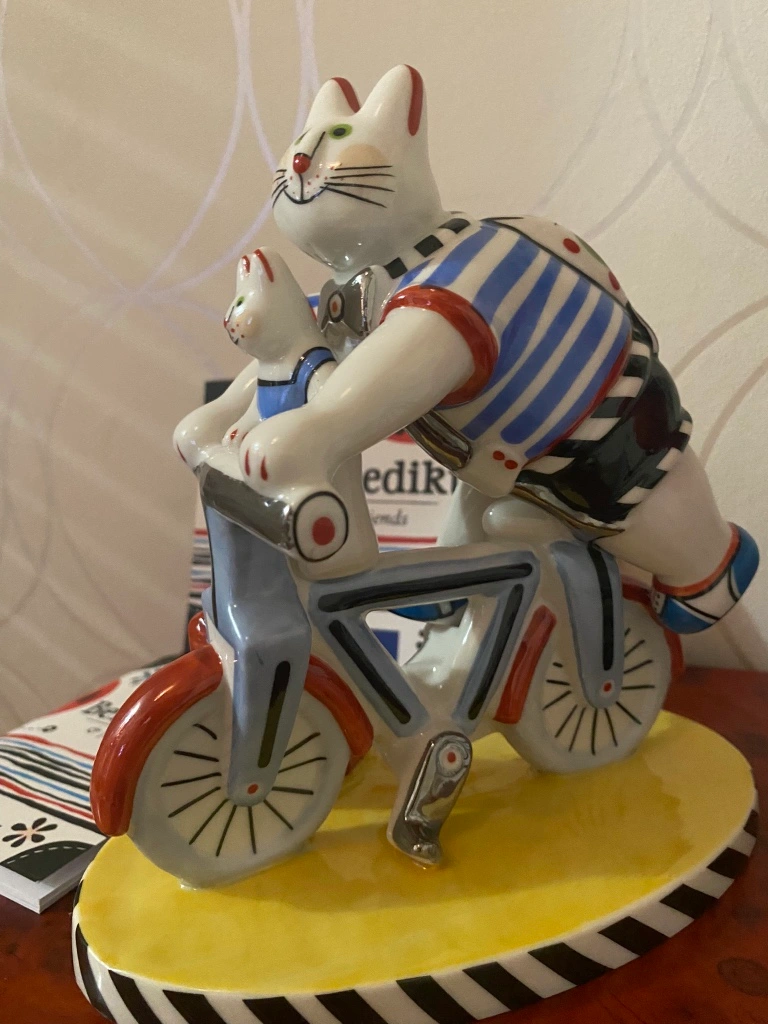 The figurine features two cats riding a bicycle. It comes with a booklet and is in its original packaging. Would make a nice gift.