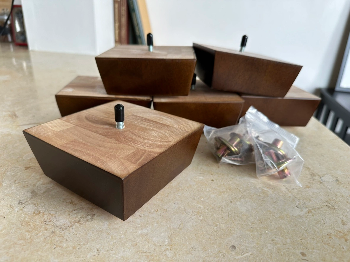 Set of 6 brand new solid wood sofa/furniture legs. Hardware for installation included. Height = 2 inches 2 additional legs available - not the same style but same height - also brand new and would be useful for a sectional sofa.