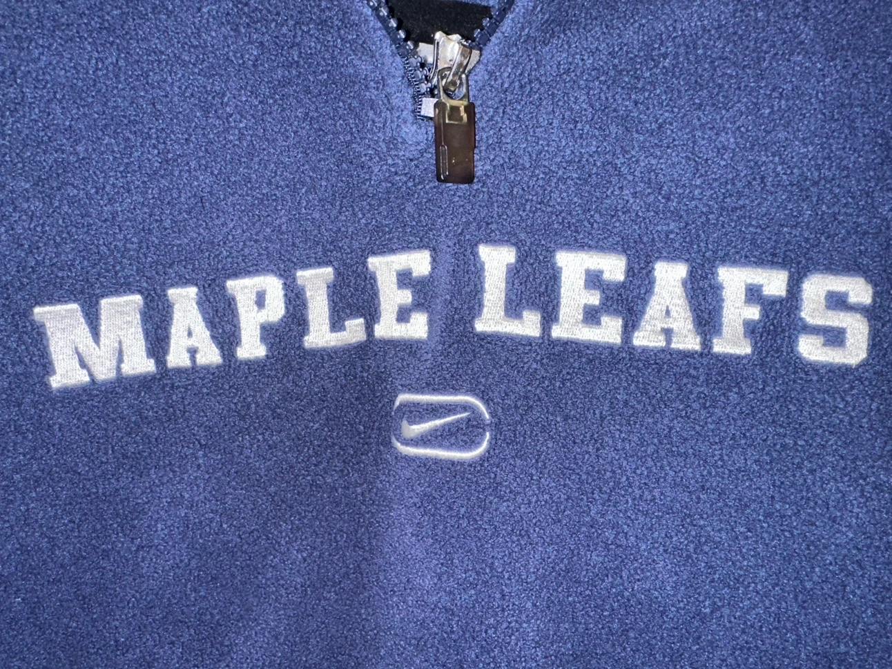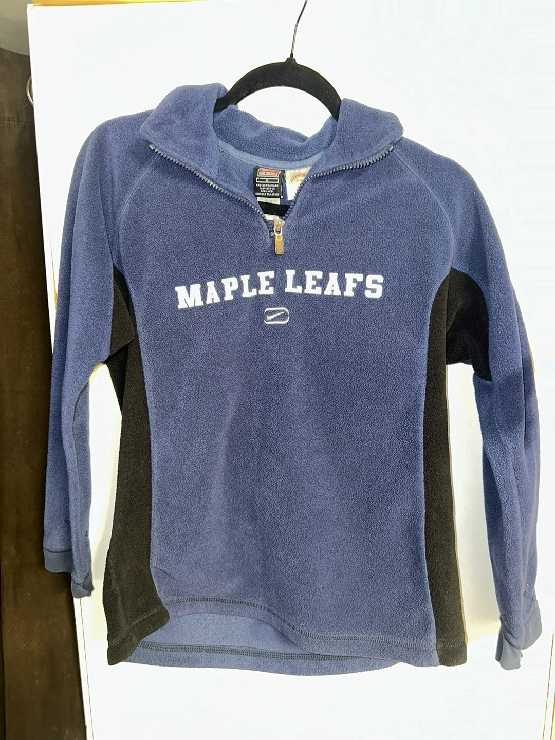 Details: Official Nike fleece with Toronto Maple Leafs logo. 1/4 zip up. Has a black insert on the sides. Size: Kids Size Medium. Condition: Good If interested, feel free to message. Thanks and have a great day.