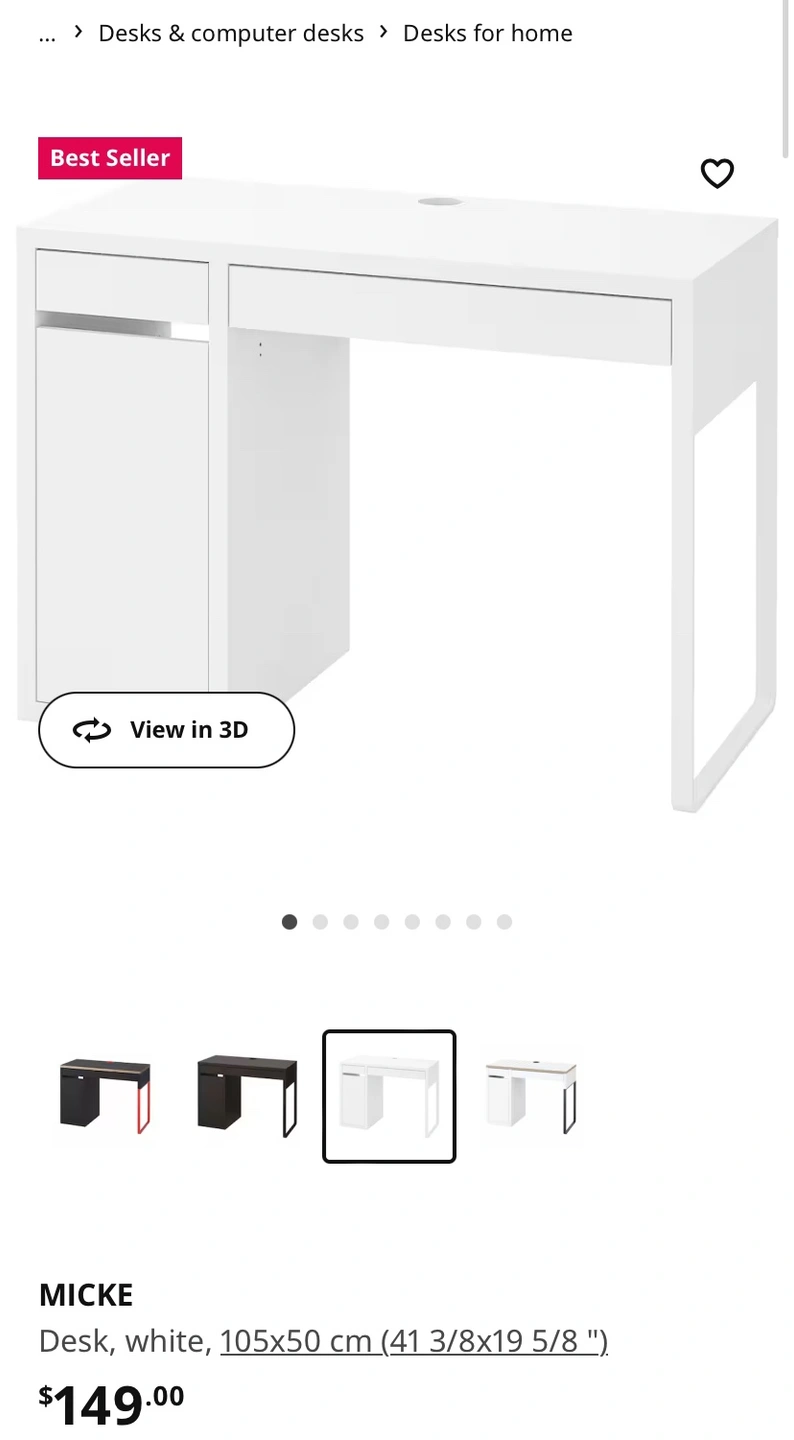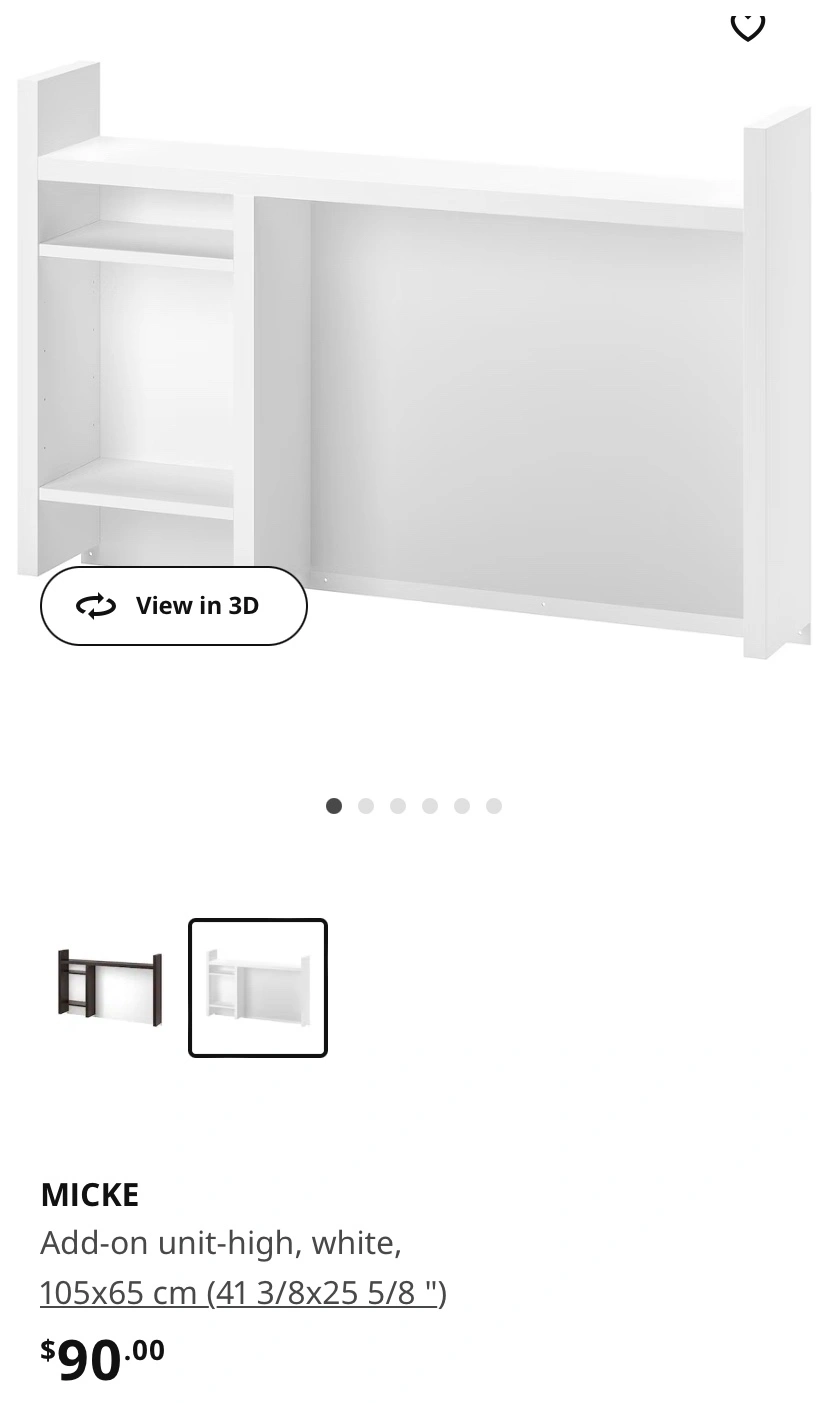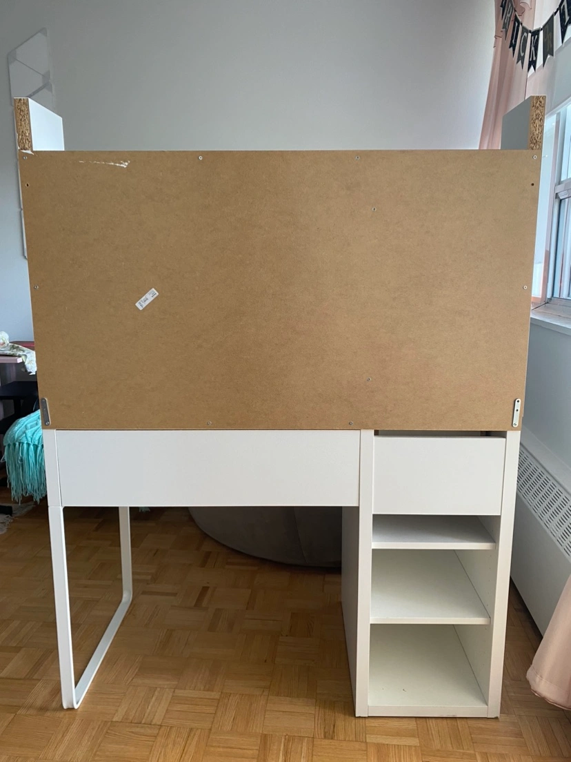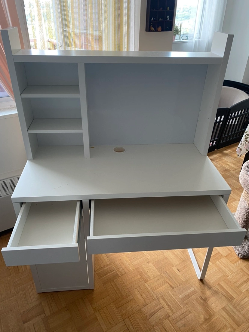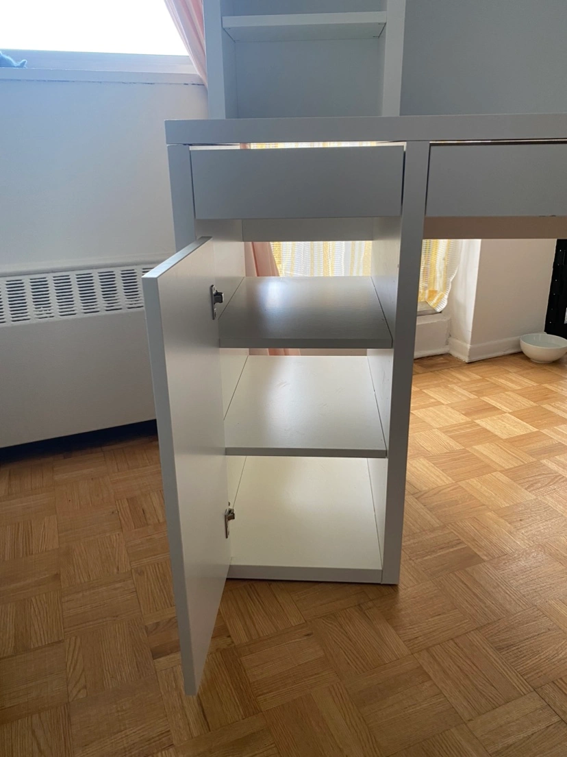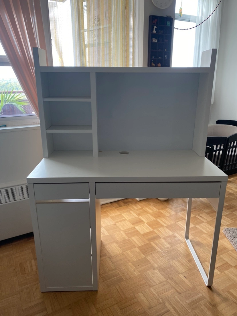IKEA Micke desk in white + Micke add-on top unit / shelves. Some light scuffs on the top, see pictures. All cabinets roll out smoothly, the door opens well. Retails for $150 desk + $90 add-on. Cannot do delivery. Must be able to bring it down the hallway (needs two people). Pick up near Greektown.
