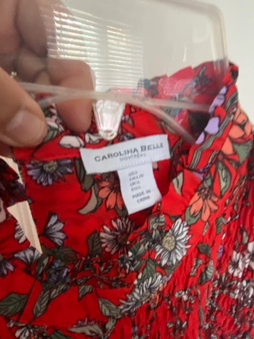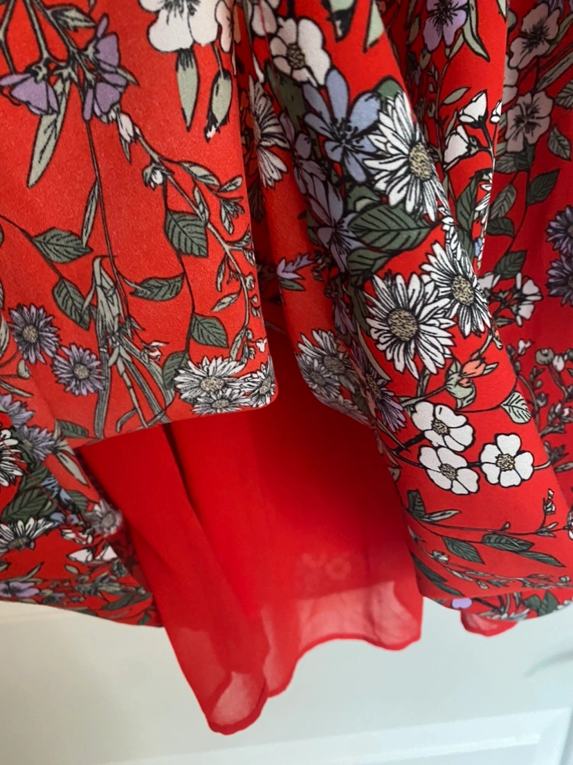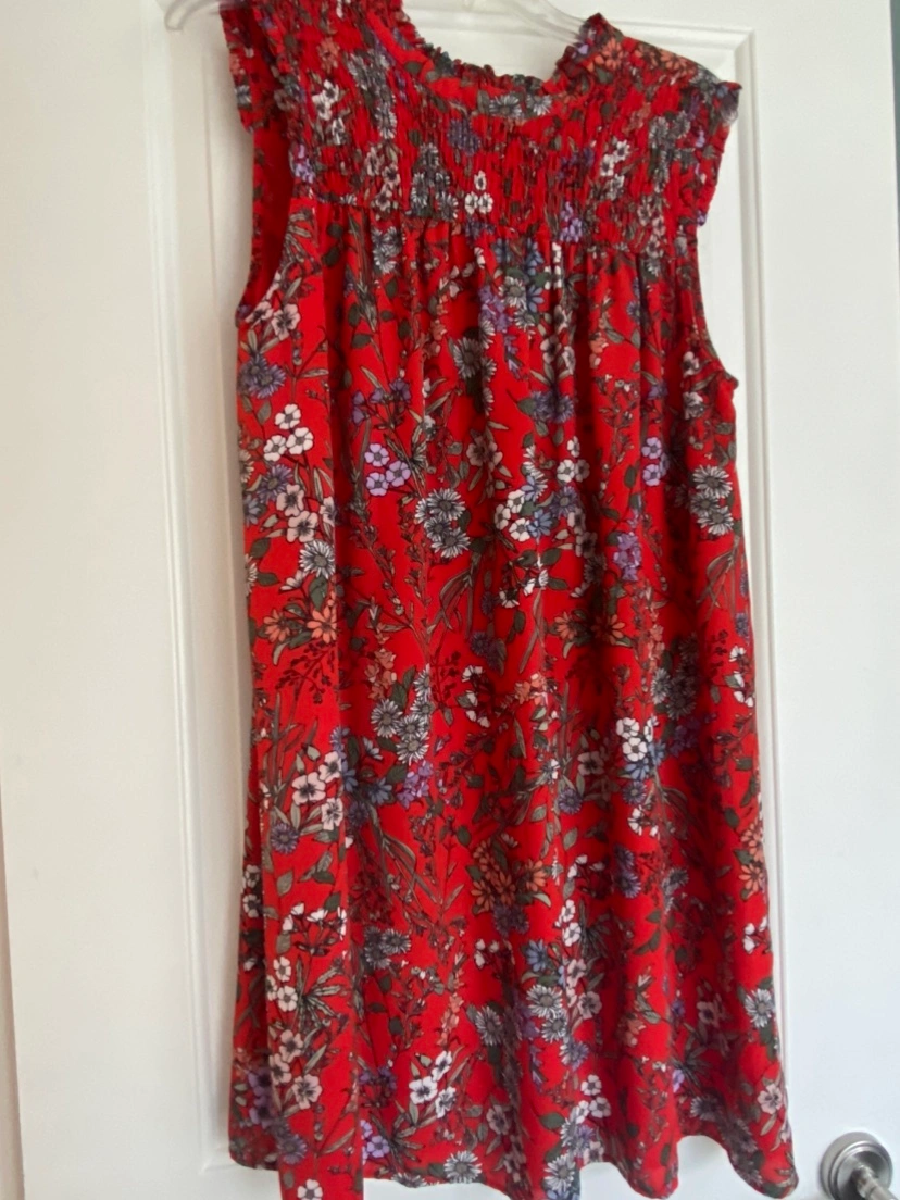 Red floral sleeveless dress with a smocked bodice. Fully lined. . Size large. Very pretty on. Length is just at the knee or above.