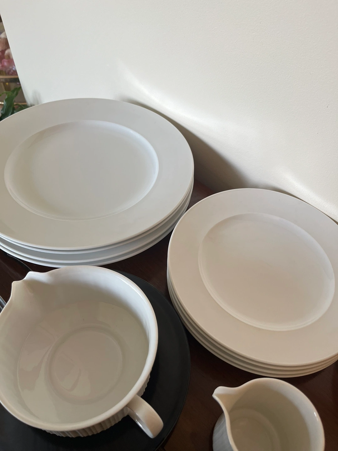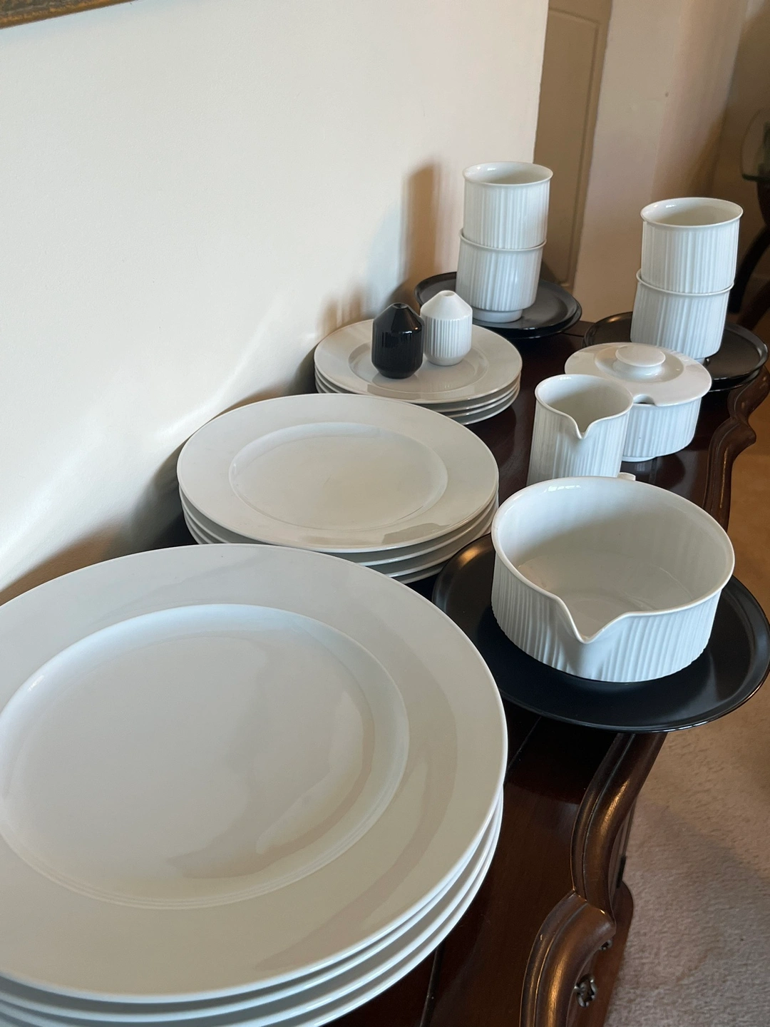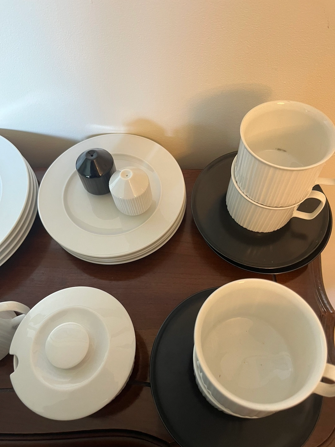 Set of vintage (1970s) Rosenthal Studio-Linie dishes. Black & white. Includes the following: 4 dinner plates, 4 salad plates, 4 dessert plates, 4 cups & saucers, cream & covered sugar, salt & pepper, gravy boat & saucer (gravy boat has tiny nick on spout as shown - otherwise all is in excellent condition). Made in Germany. Selling the set for $135. Similar listings for individual pieces can be found online at much higher prices. Available for pickup in Markland Wood.