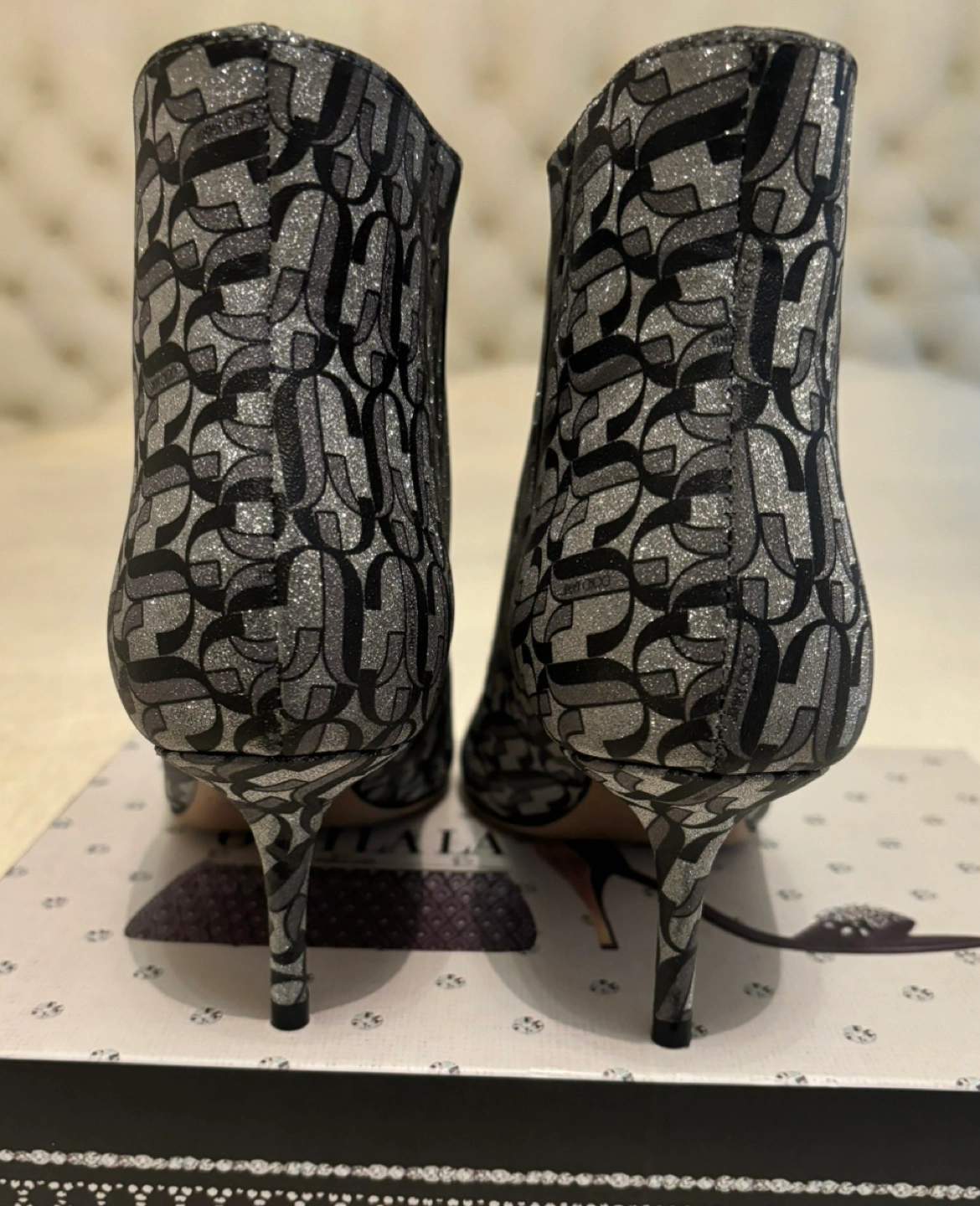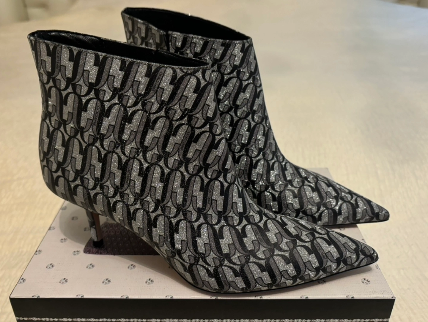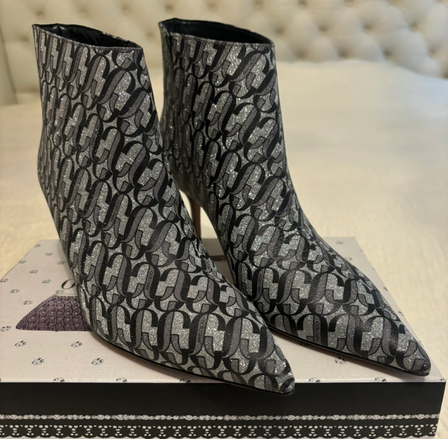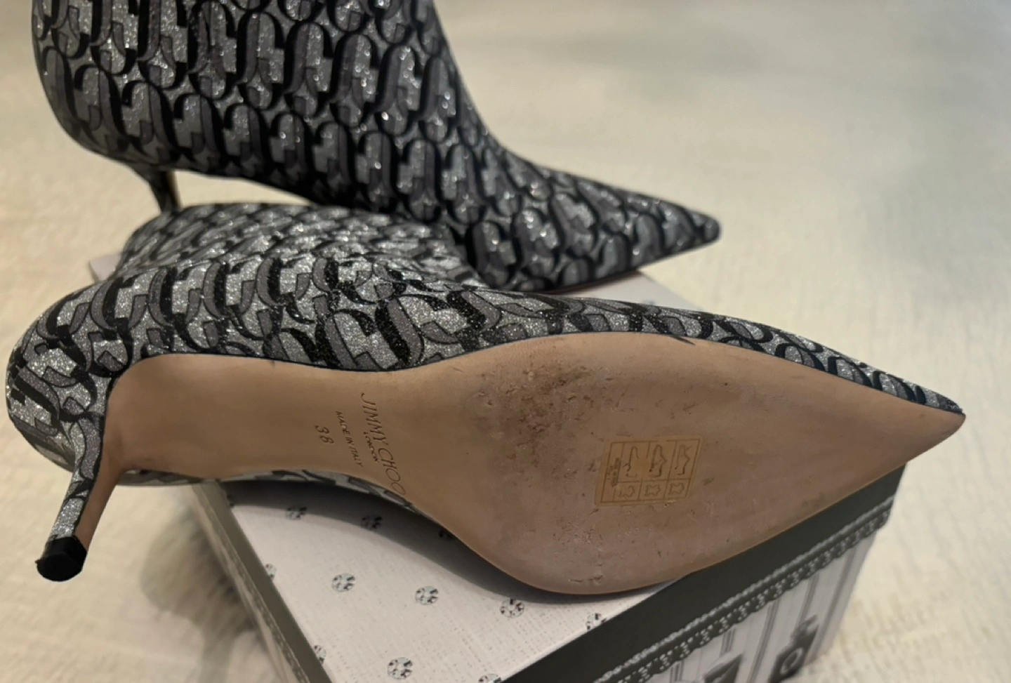 Beautiful Black and silver sparkled ankle boots with a pointed toe and Jimmy Choo logo on it. Only wore it once, the shoe is a bit narrow for my feet and that’s why selling it. Original price was over $1000.
