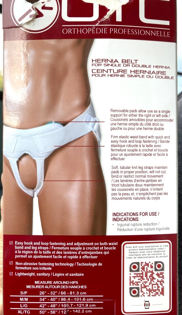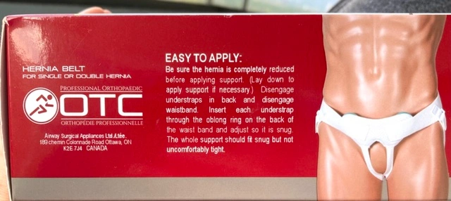 This is a hernia support belt for single or double hernia, made by OTC. The box is open but the belt was never used. All pieces pads included