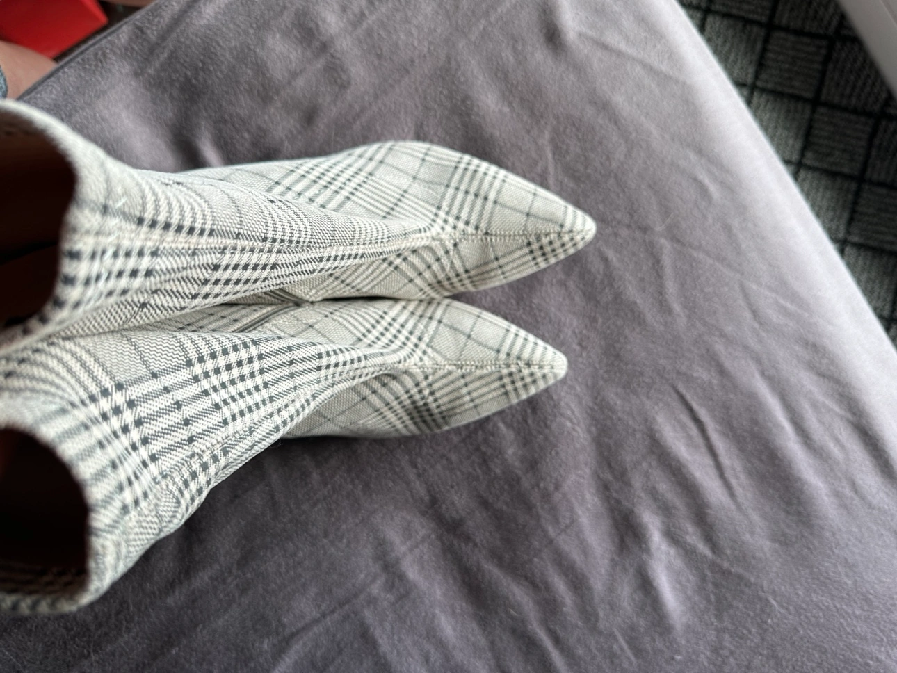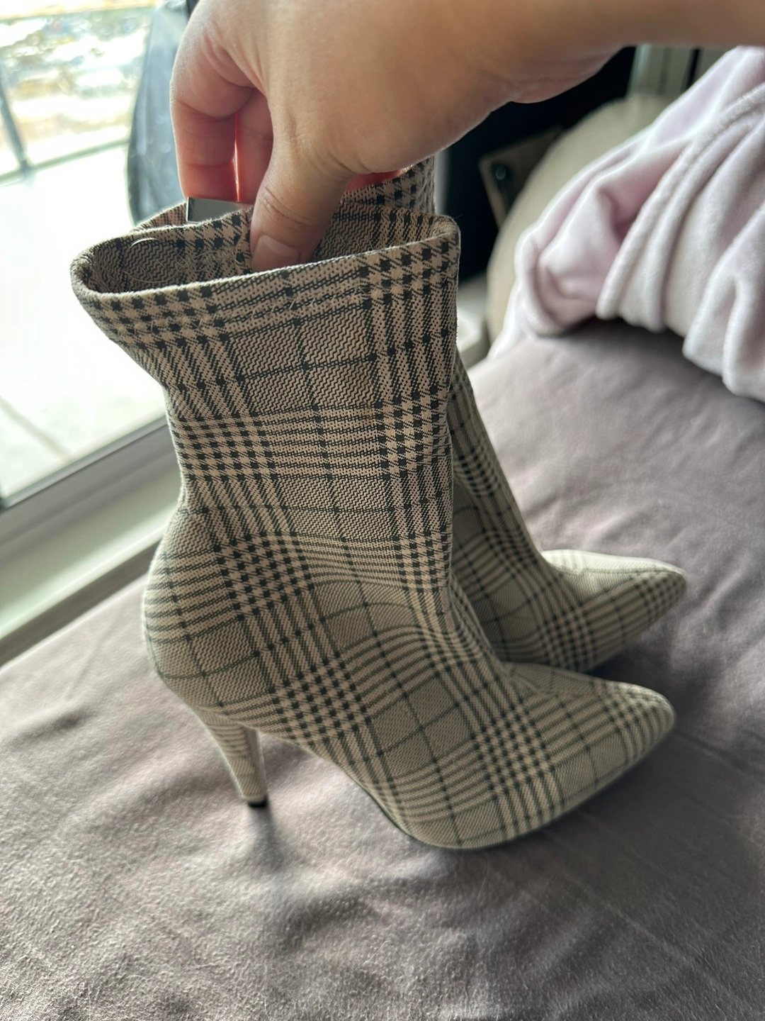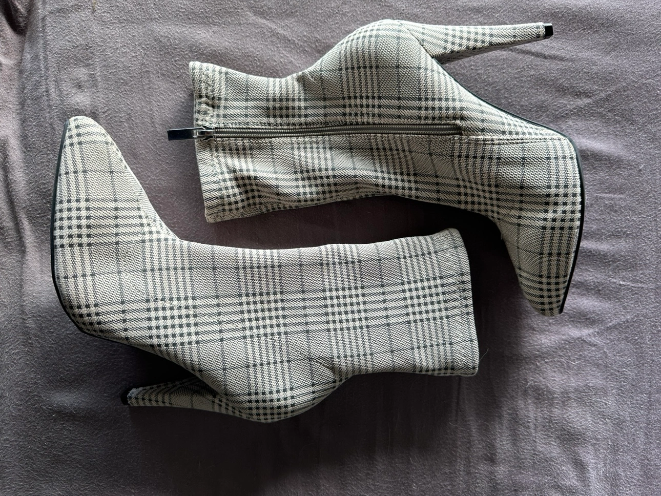 pair of black and white plaid booties with a pointed toe and a stiletto heel, flexible fabric. They have a zipper on the inside of the ankle. Never worn. I have them in Brentwood Concord but I could deliver in commercial broadway skytrain station.