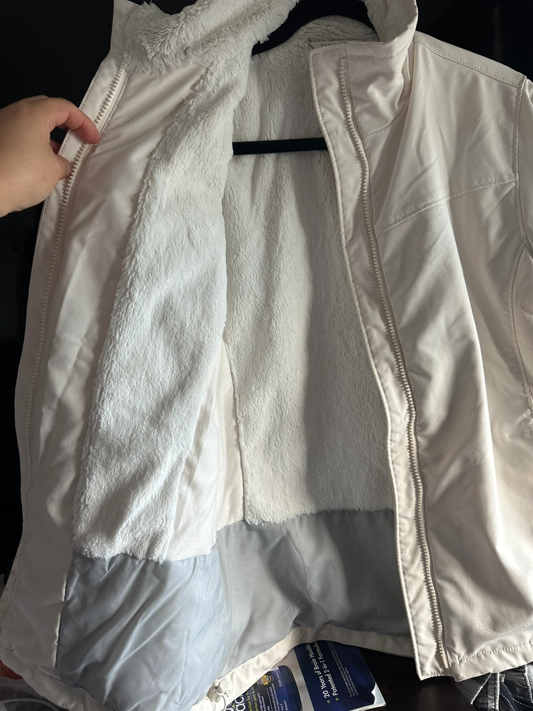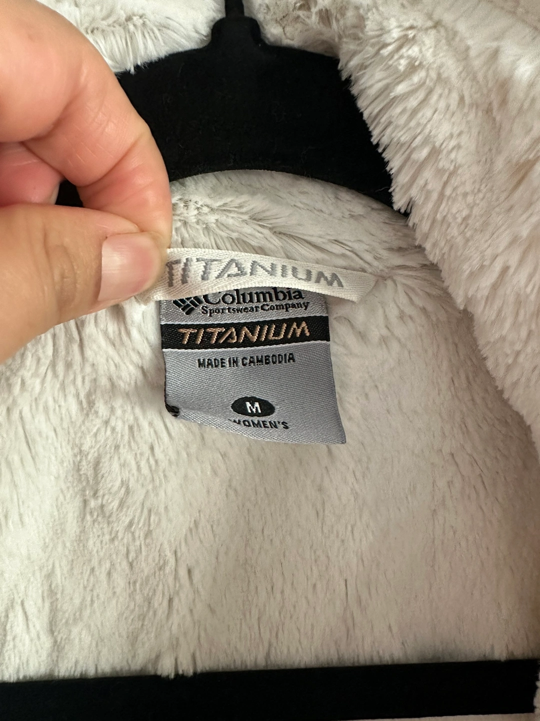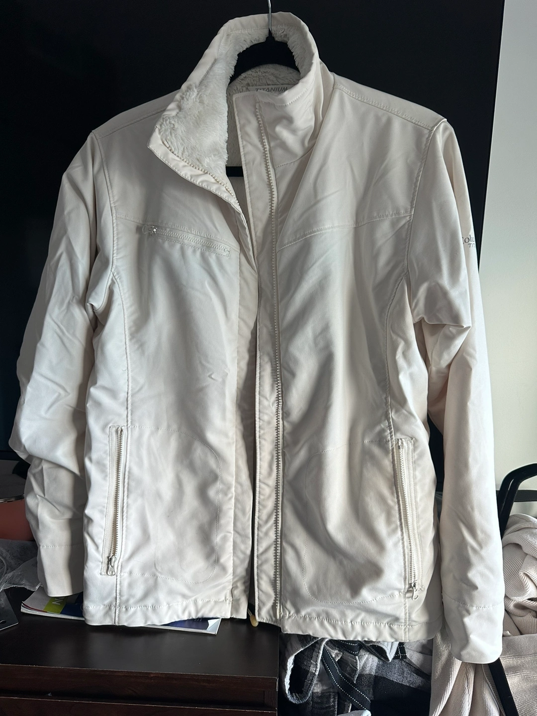 Women's size medium jacket with zipper closure and fur lining. It has two side pockets with zippers and one chest pocket with a zipper. The jacket is off white/ivory with a Columbia logo on the sleeve. Excellent condition, no stains. I have it in Brentwood Concord but I could deliver in commercial broadway skytrain station or in front of pacific centre mall