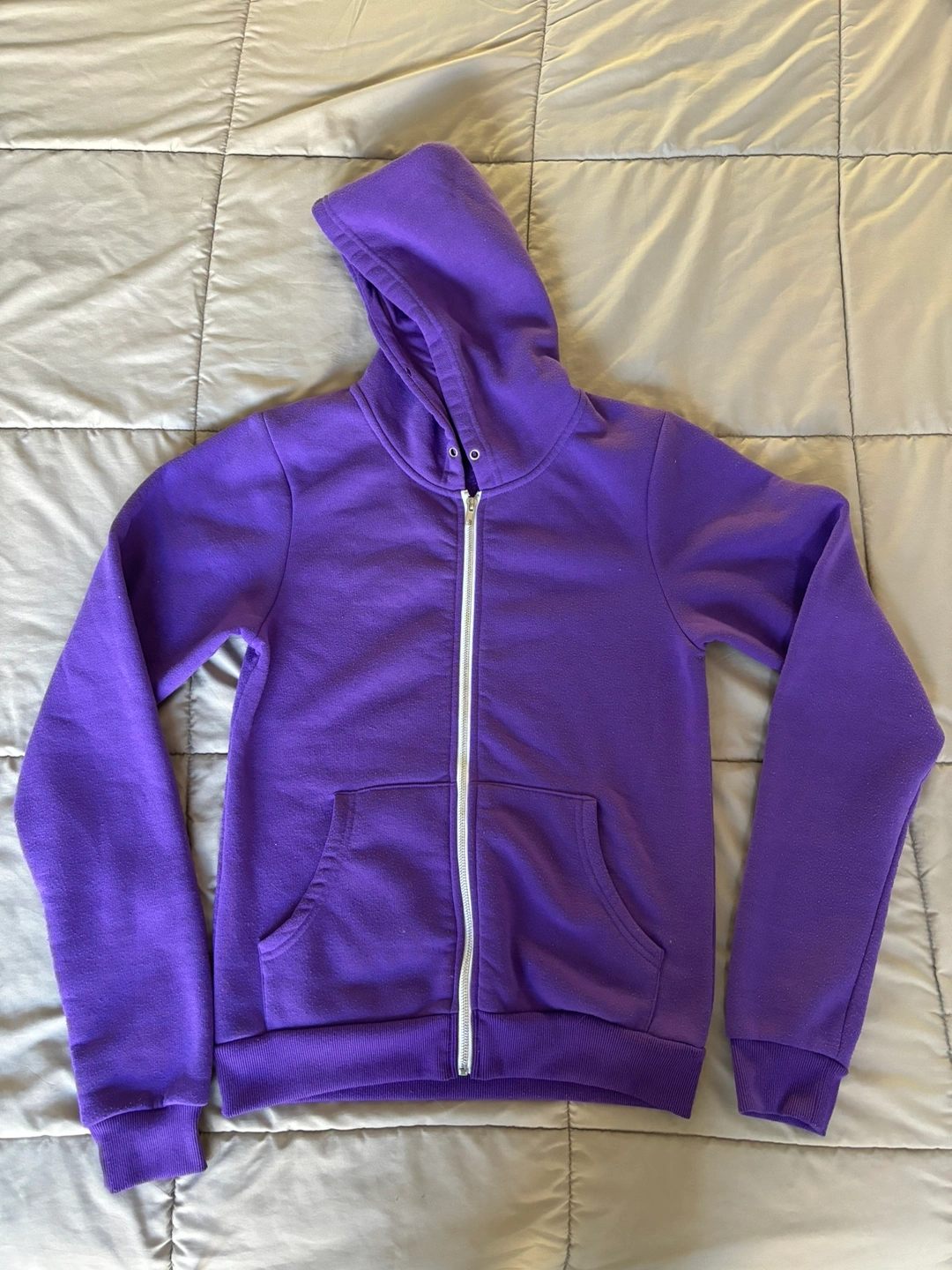 A purple zip-up hoodie with a white zipper. It has a kangaroo pocket on the front and is lined with fleece. Tyndall Avenue and Thorburn Avenue Smoke, pet, children free home Cash only. Delivery available not included in the price