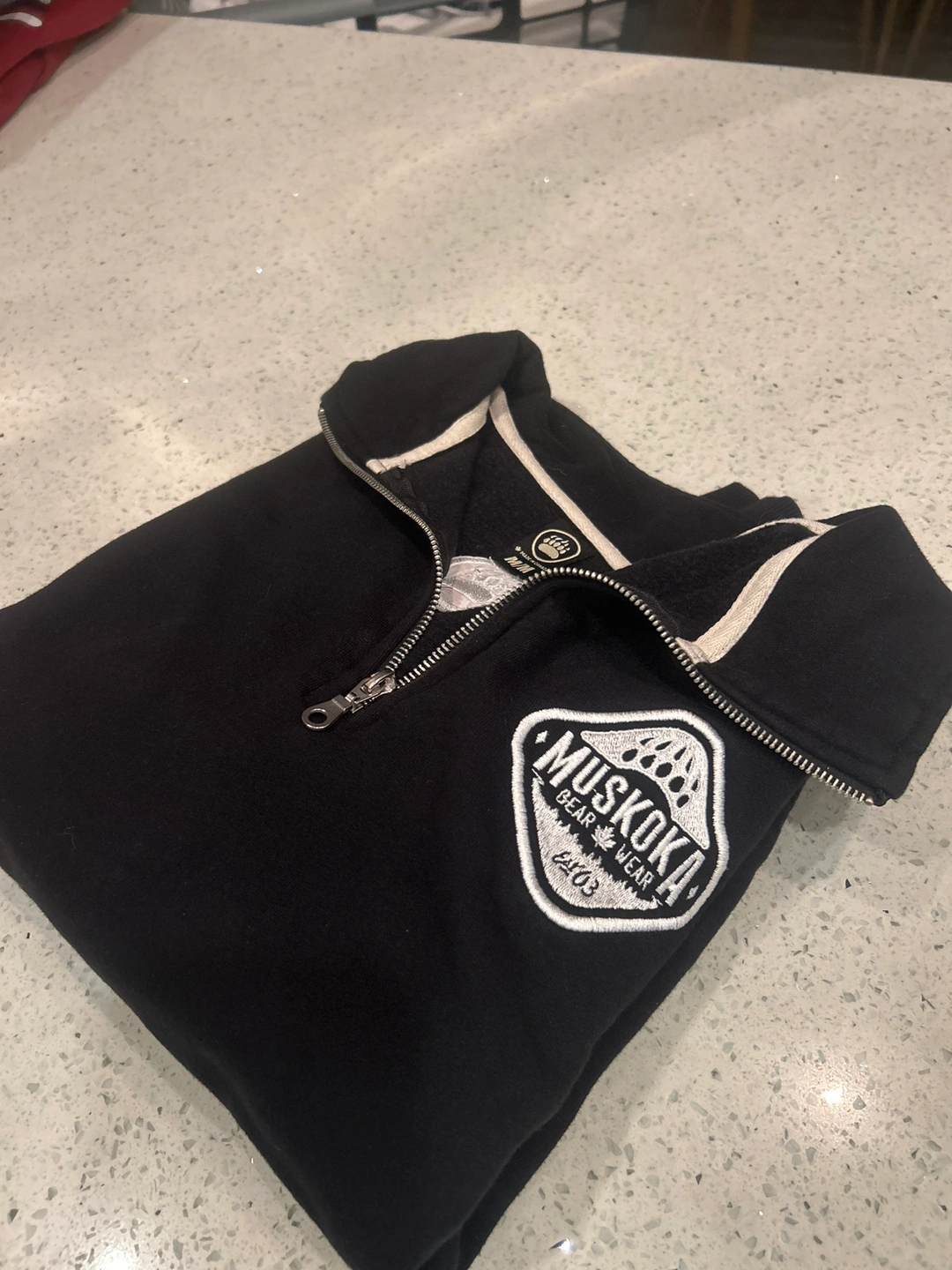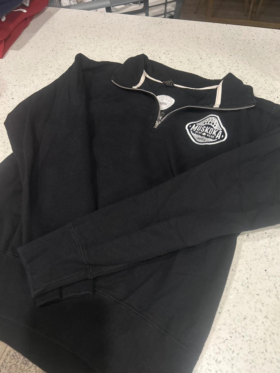 Black 1/4 zip sweater with Muskoka Bear Wear logo.