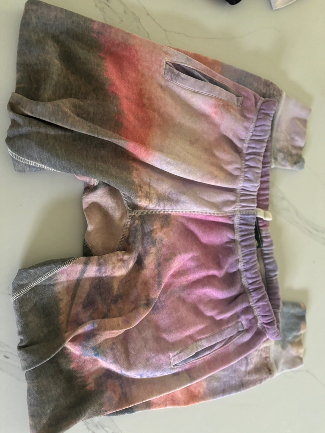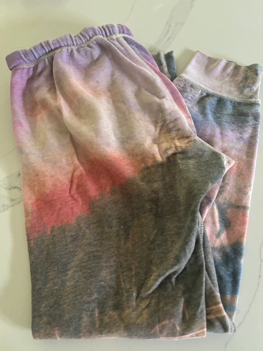 These are cute and comfy sweatpants with a tie dye pattern. They are a small-petite size and are perfect for lounging around the house. They would also be great for wearing to the gym or running errands. They are in great condition and have no rips or tears. The elastic waistband is still strong and the drawstring is still intact.