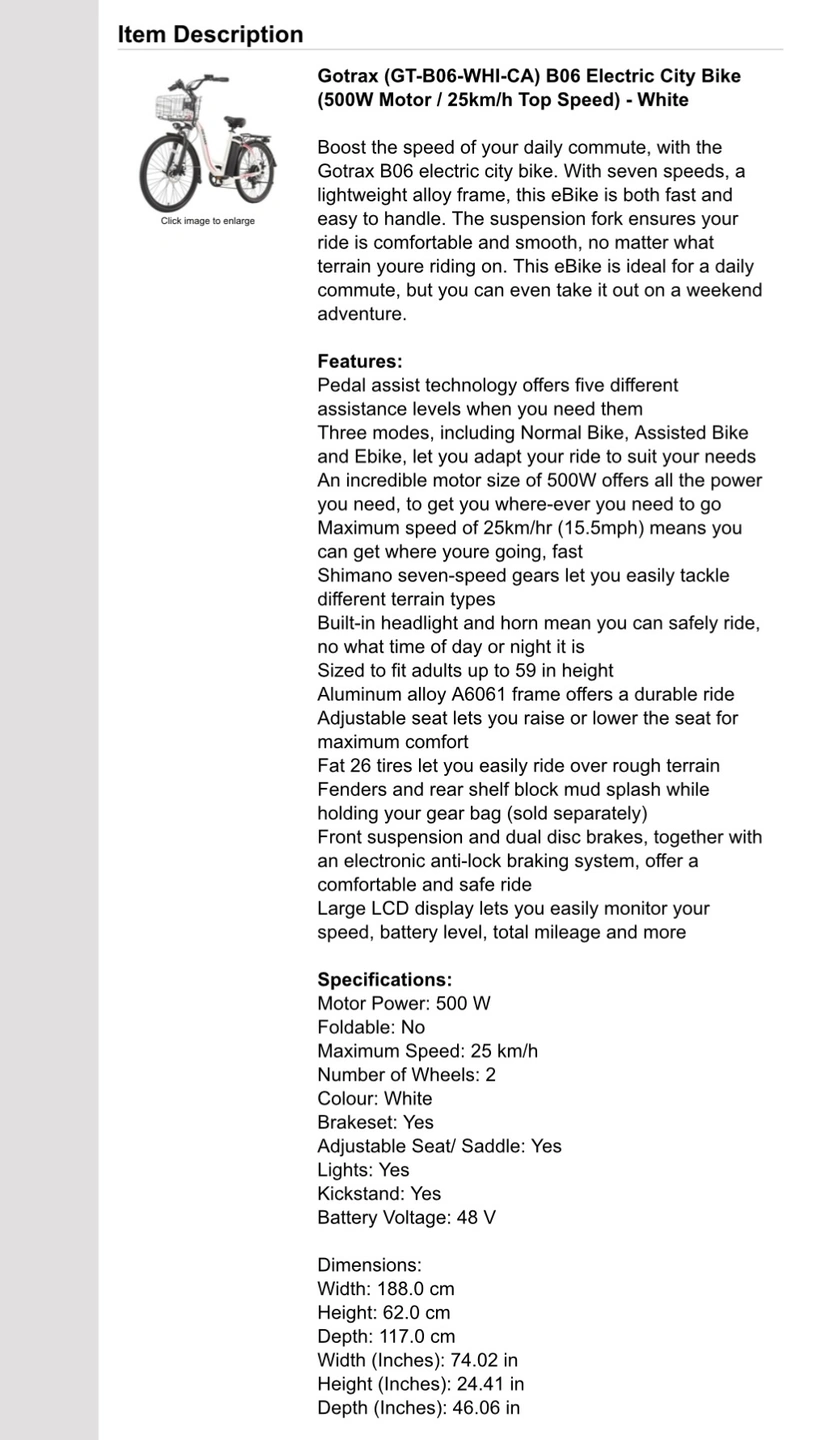 BRAND NEW IN BOX! All accessories sealed and included. MSRP $ 1,299.99 + tax BEST OFFER or FIRST COME! (Offers below $700 will not get a response) Items Included: Gotrax (GT-B06-WHI-CA) e-bike Keys Manuals Charger Accessories Basket Unit has been tested and is fully functional. At time of testing, battery is holding a perfect charge but battery life cannot be guaranteed. OEM box included. OEM box has severe wear and tear from shipping however unit is not affected whatsoever. Pay via Cash, Credit, e-transfer, crypto, Apple Pay, & MORE! **Delivery and Shipping is possible depending on location and small fee. Delivery and shipping fees must be paid in advance by you regardless of purchase** https://www.bestbuy.ca/en-ca/product/gotrax-b06-electric-city-bike-500w-motor-25km-h-top-speed-white/17701590 Caveat emptor It is the duty of the buyer to inspect, test, and agree to our products prior to completing transaction. You accept full responsibility of the product the second money exchanges hands even if you choose to not test and inspect. If the unit is factory sealed and you decide to break the seal to inspect and test, you agree to complete the sale as long as the product inside is in adequate condition.