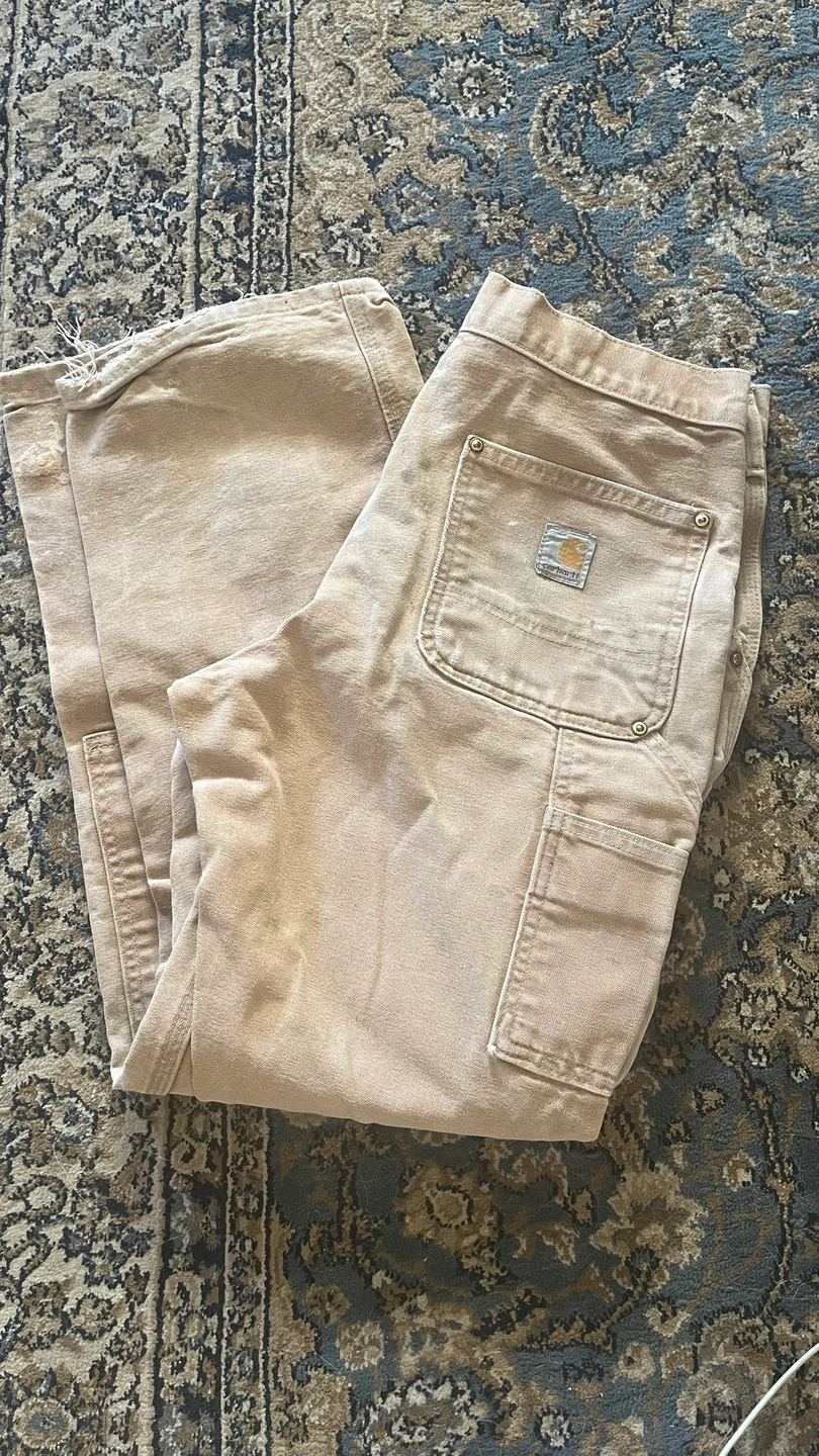 Beige work pants with a hammer loop, tool pockets, and a back patch pocket.