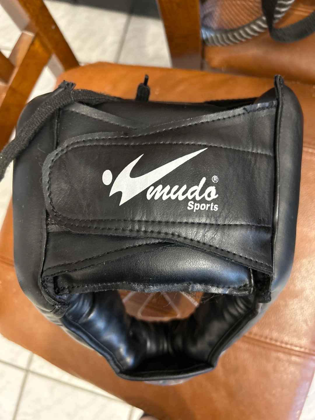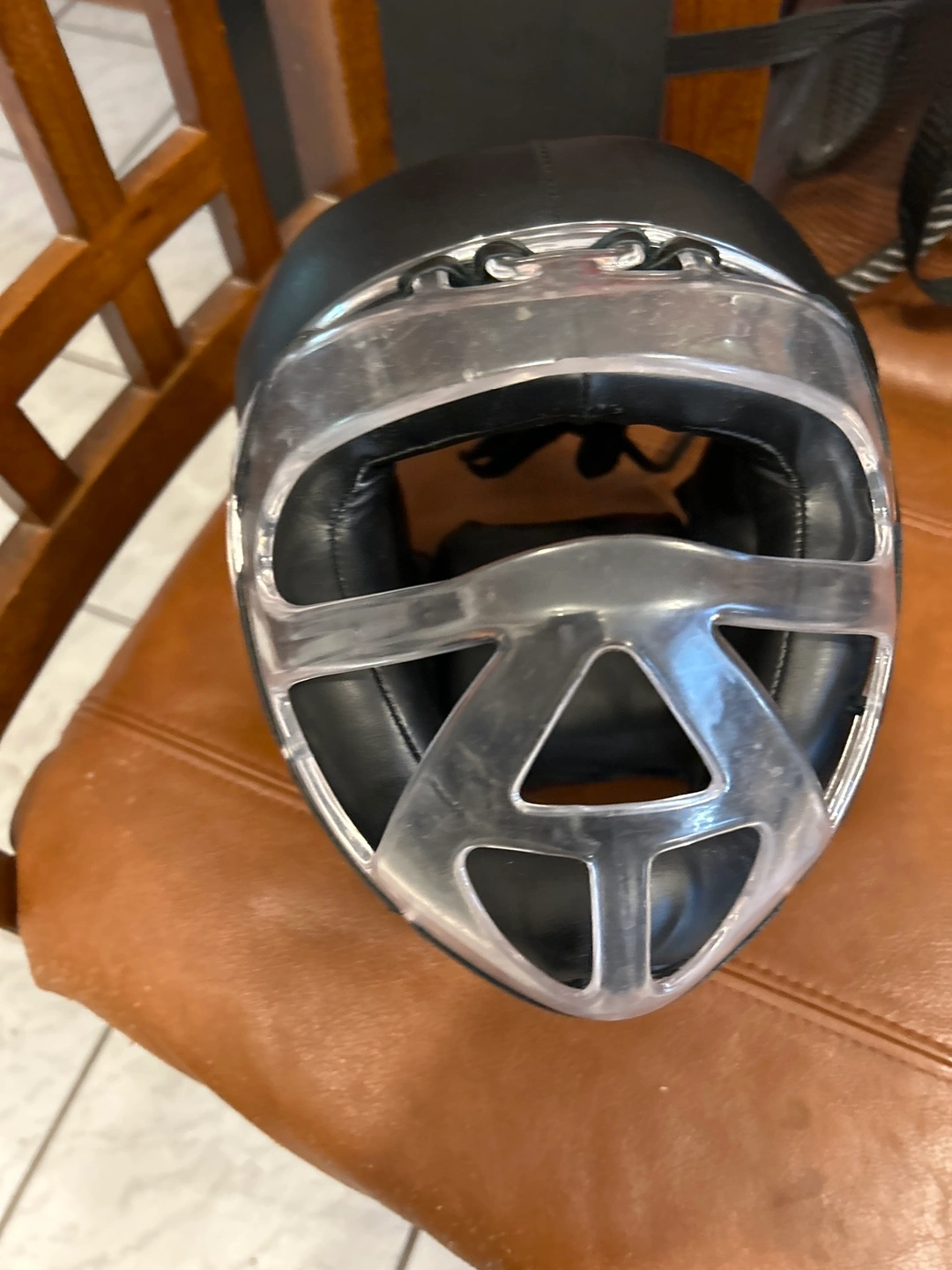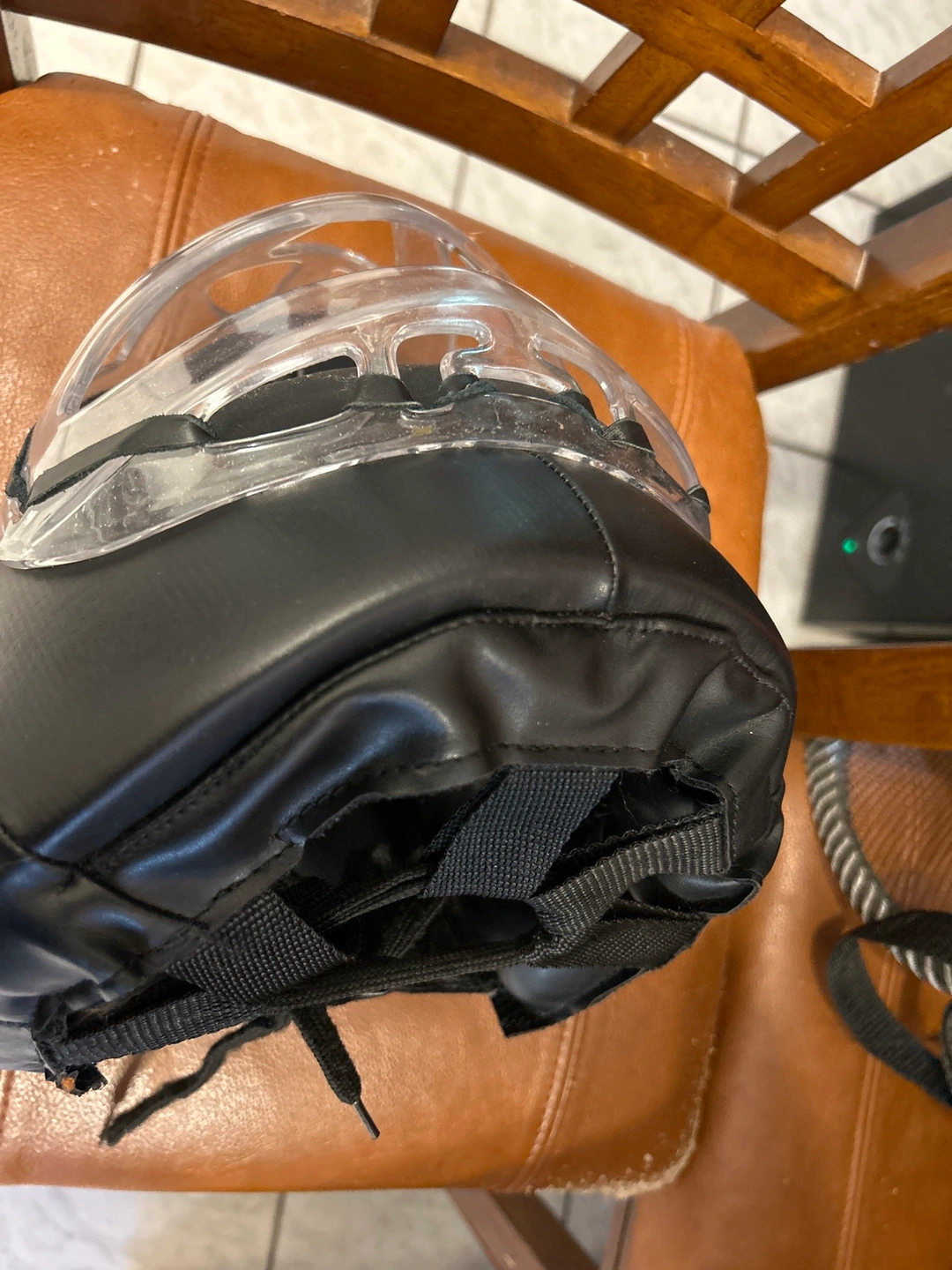 Headgear with a clear plastic face guard and a black leather exterior. Features adjustable straps.