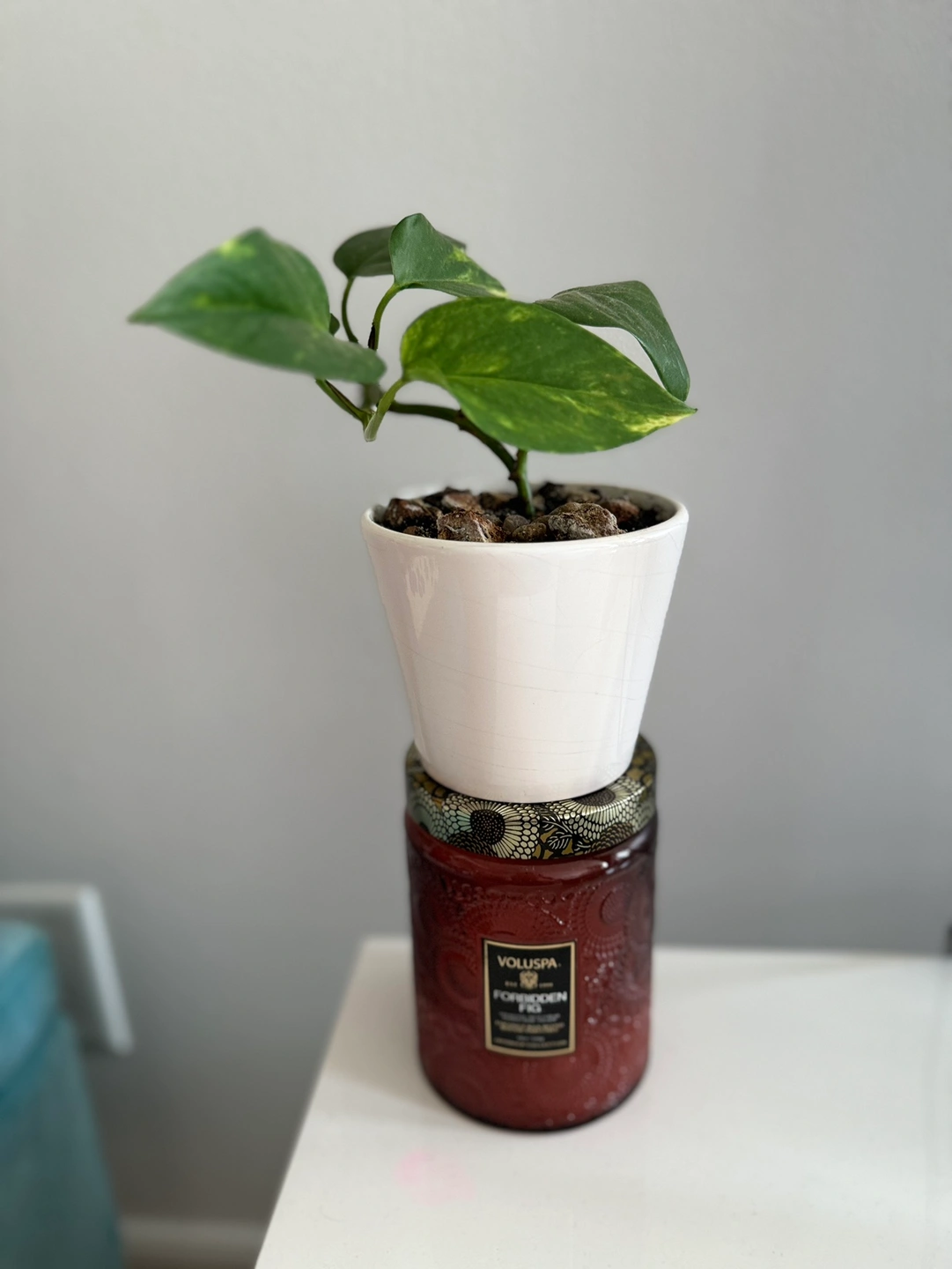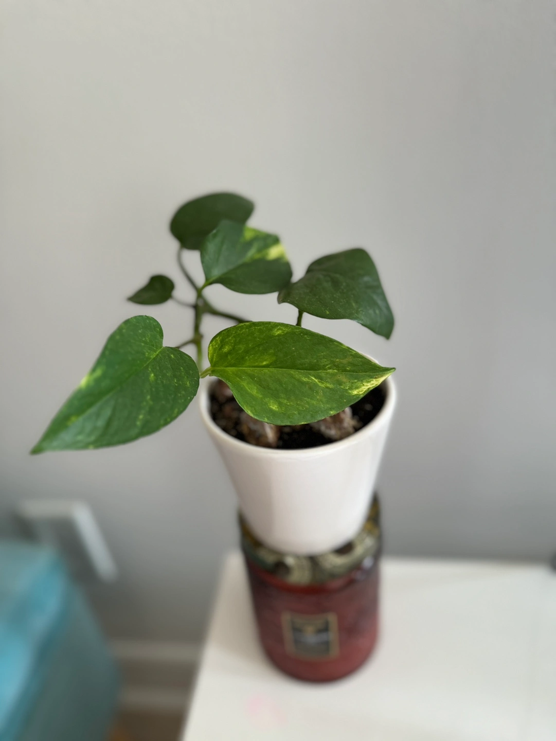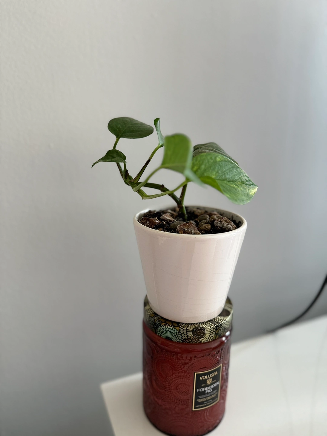 A small, healthy golden pothos plant in a white pot. The plant is about 6 inches tall with the pot. It is a beautiful addition to any home. The plant is easy to care for and will thrive in bright, indirect light.