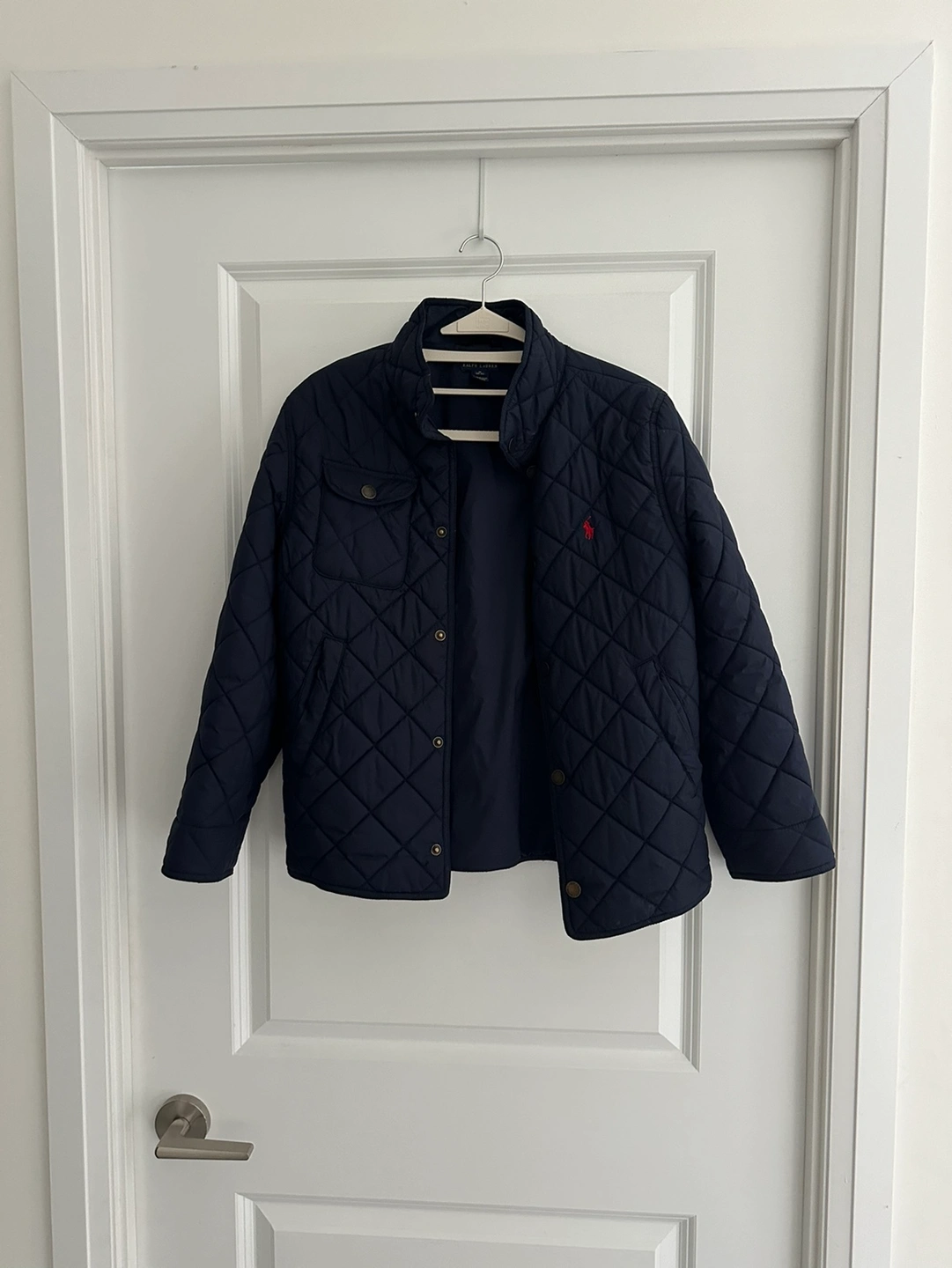 Size M (10-12) Boys. Blue quilted jacket with a Polo Ralph Lauren logo on the left chest. The jacket has a zipper closure and two front pockets.