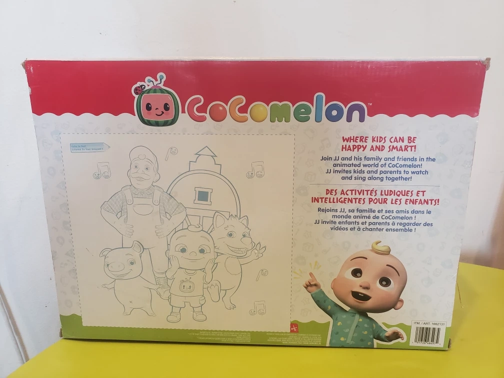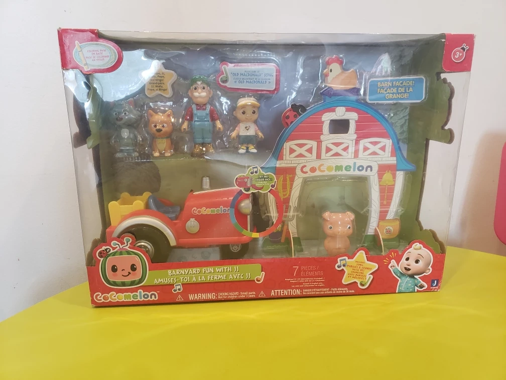 CoComelon Barnyard Fun Playset with 7 pieces and a tractor that plays music. This set includes a barn, a tractor, JJ, a pig, a dog, a wolf, and a farmer. The playset comes with its original box.