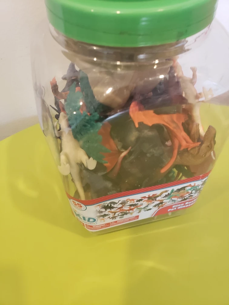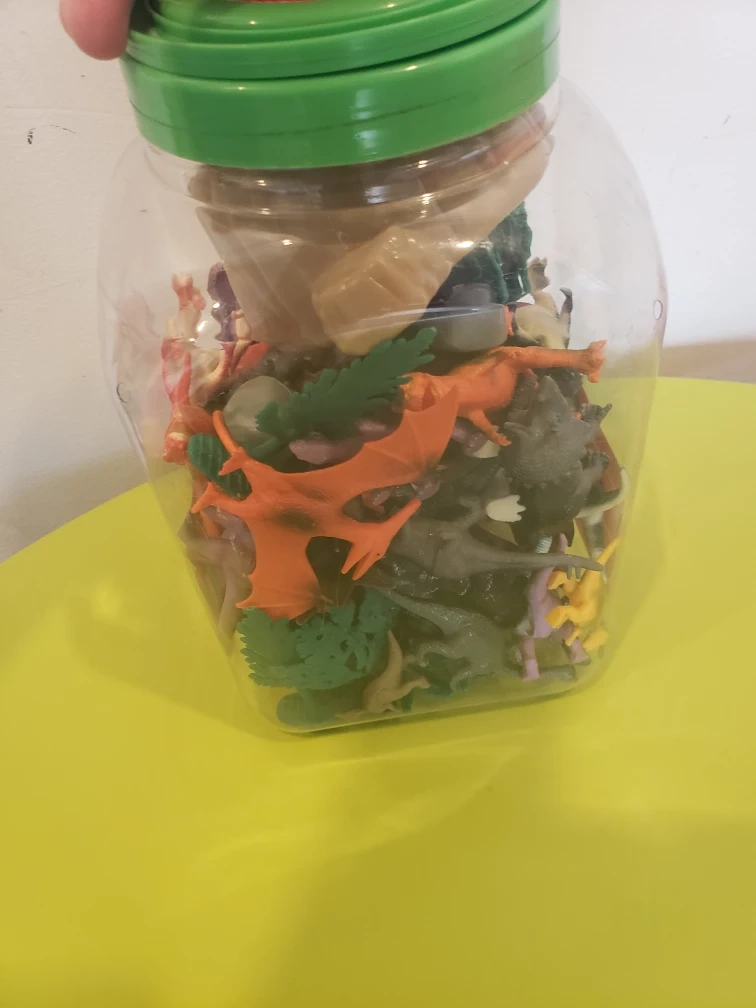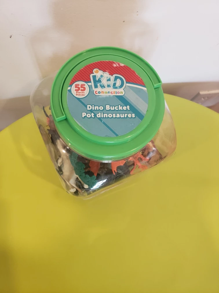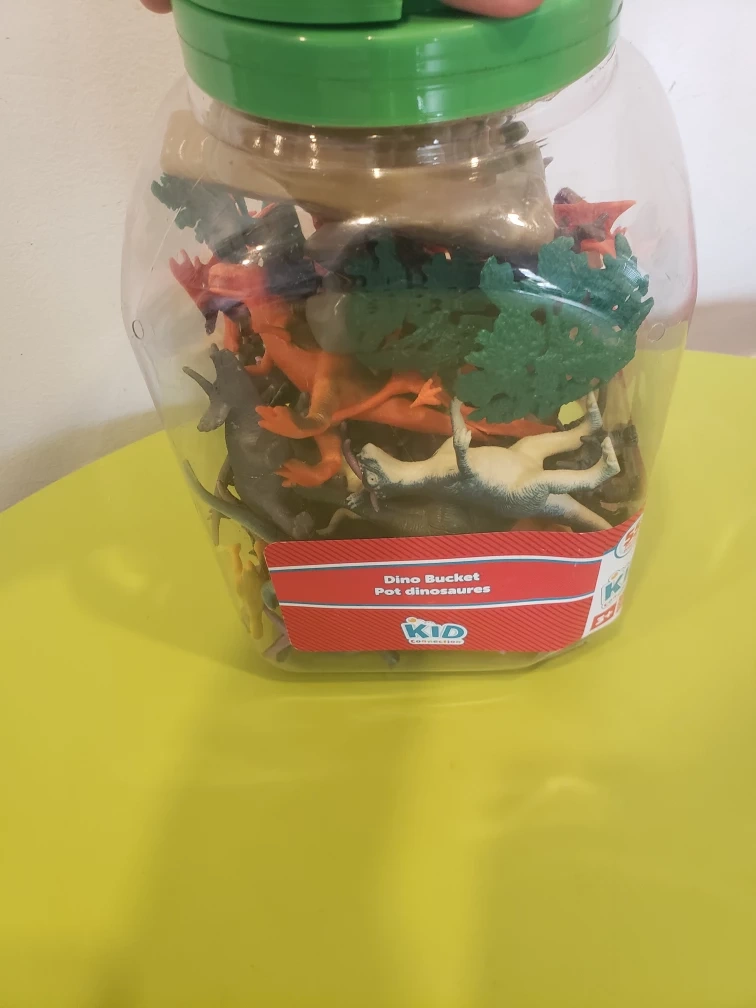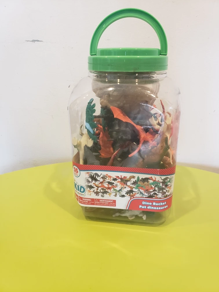 A plastic bucket filled with plastic dinosaur toys. There are a variety of colours and types of dinosaurs, as well as some trees. The bucket is clear plastic with a green lid and handle.