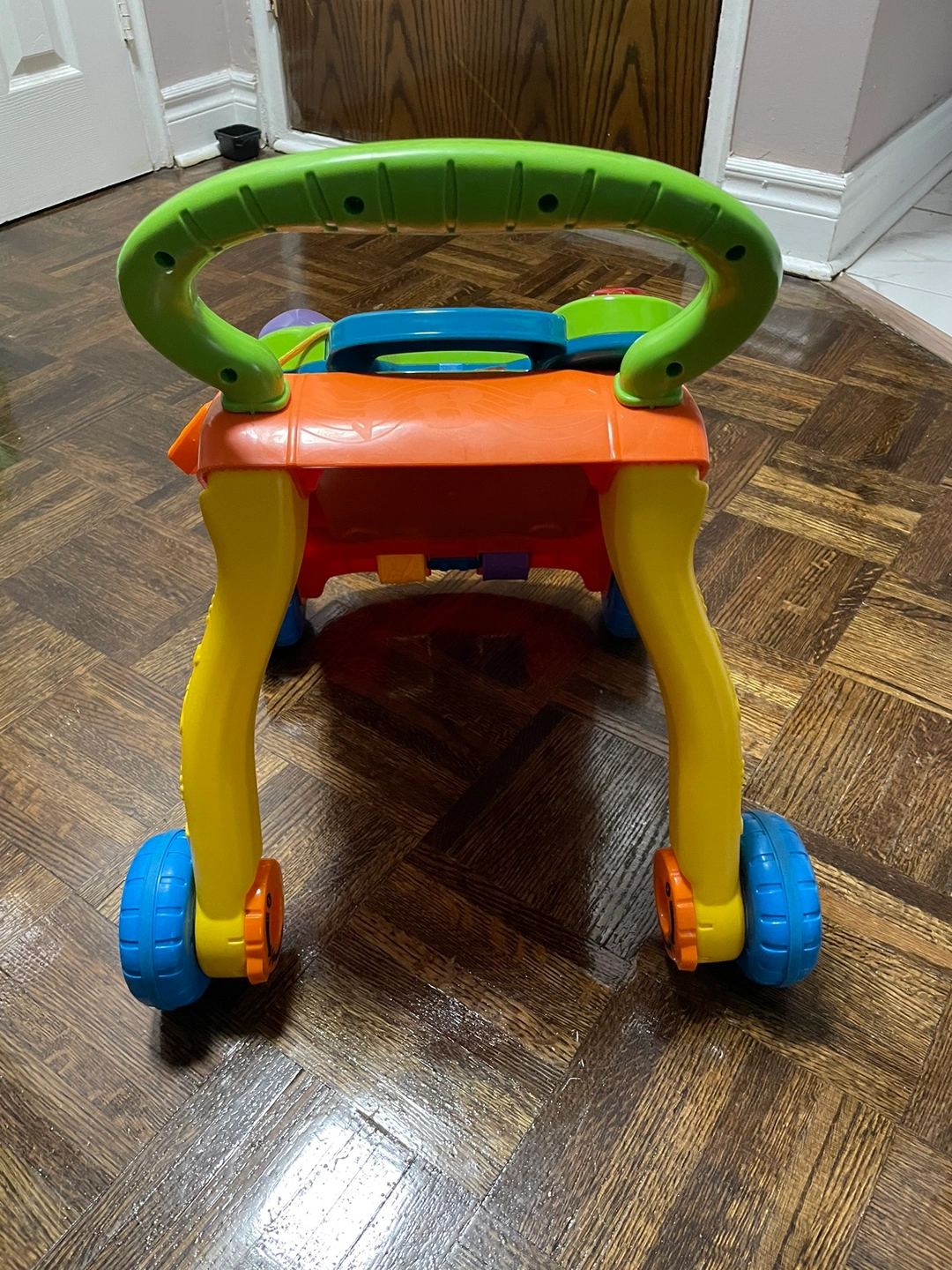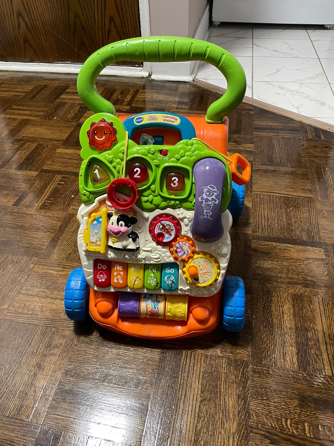 This is a VTech Sit-to-Stand Learning Walker. It features lights and sounds that encourage learning. It has a removable play panel for floor play. It is a great way for babies to learn to walk and have fun. There are some small scratches on the walker. Batteries included. Pick up only.