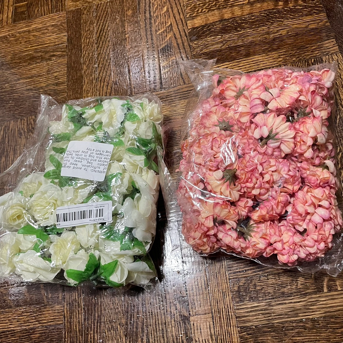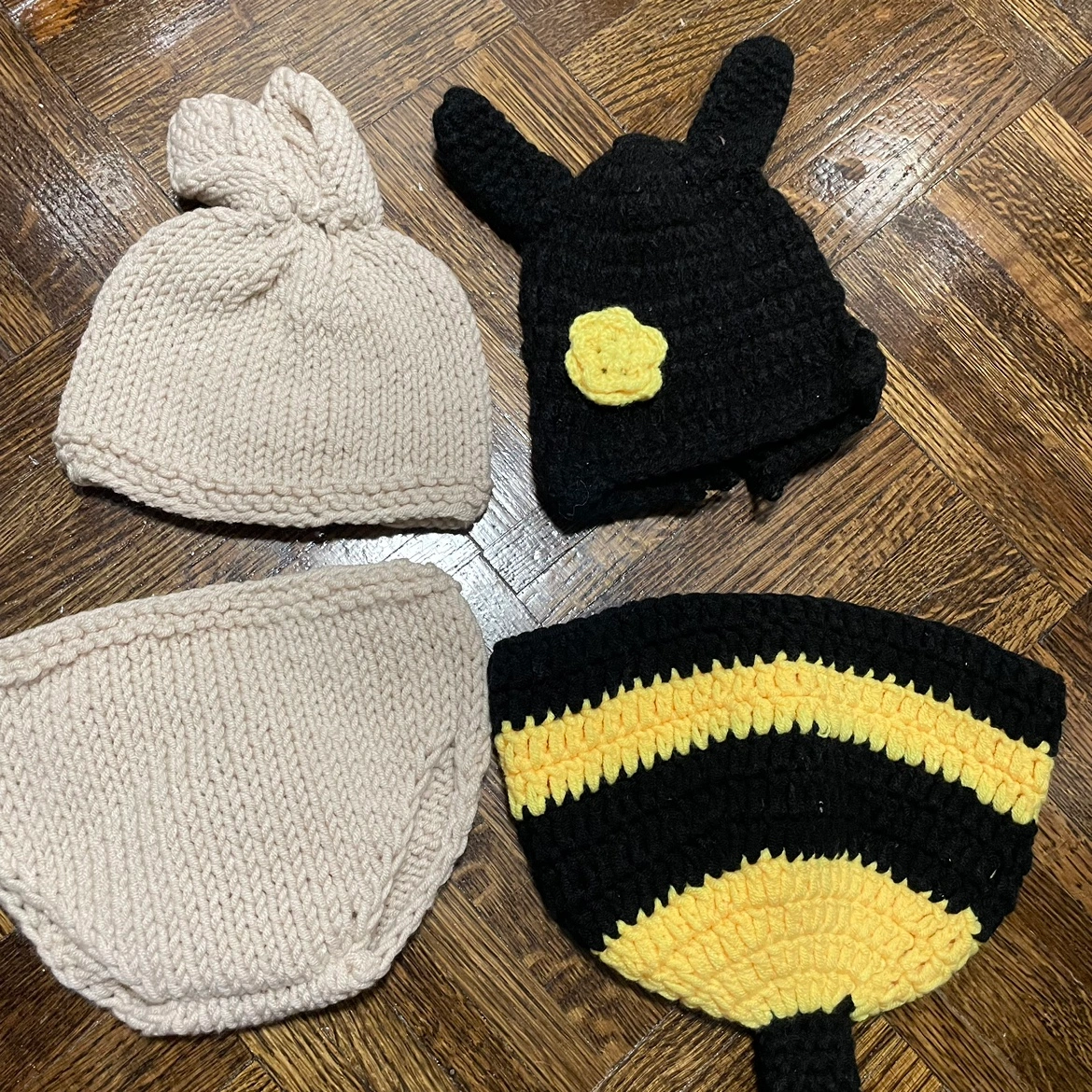 The set includes a pink fur backdrop, a white tulle backdrop, two packs of artificial flowers, a knitted bee headband and a knitted bee bottom and a bunny costume. Take all for $20 or $5 each. Pick up only