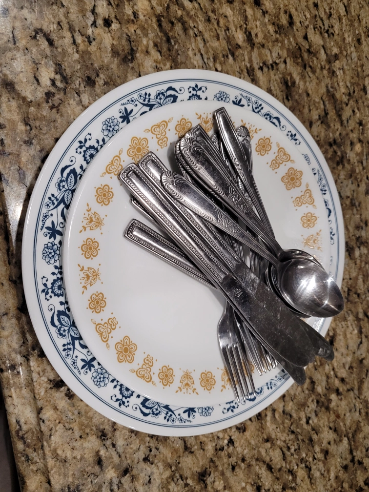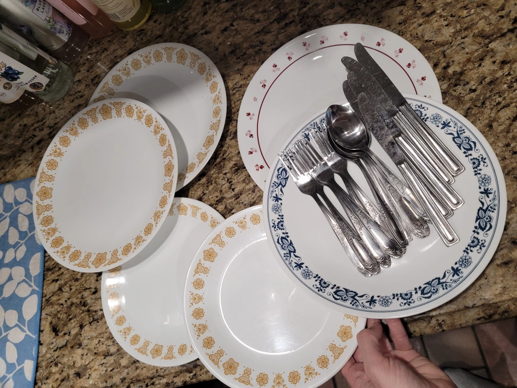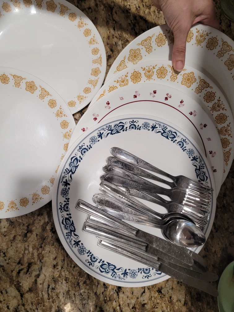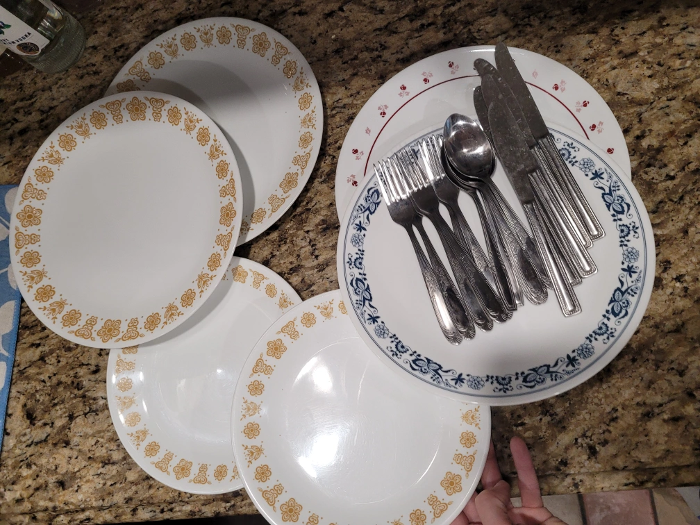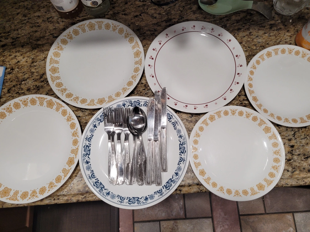 no enough interest in this item so i moved it to a max sold online auction. its open till Saturday and has a $1 starting bid with no minimum. dm me for the link to bid . Famous corelle plates. 4 large 2 medium. Assortment of patterns. Good used shape. 6 spoons 6 forks 5 butter knives. Great kitchen starter pack! Must pickup. Please. no etransfer or long holds. this is a cash price. bring cash. This is in storage and I will meet you there. I can access the building during 8 to 430 Monday to Friday. No one is there outside of those times. $20 cash deal some butterfly gold